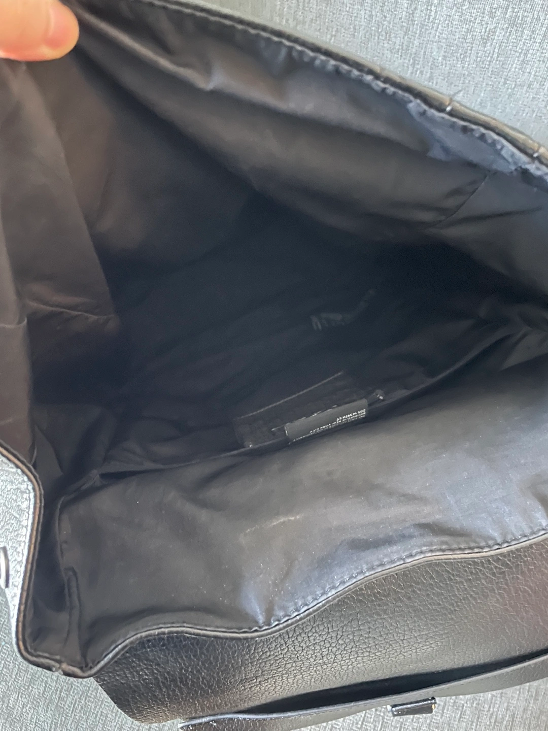 Black faux leather backpack. Features a roll-top closure and buckle. Adjustable straps. Multiple compartments. Excellent for everyday use.