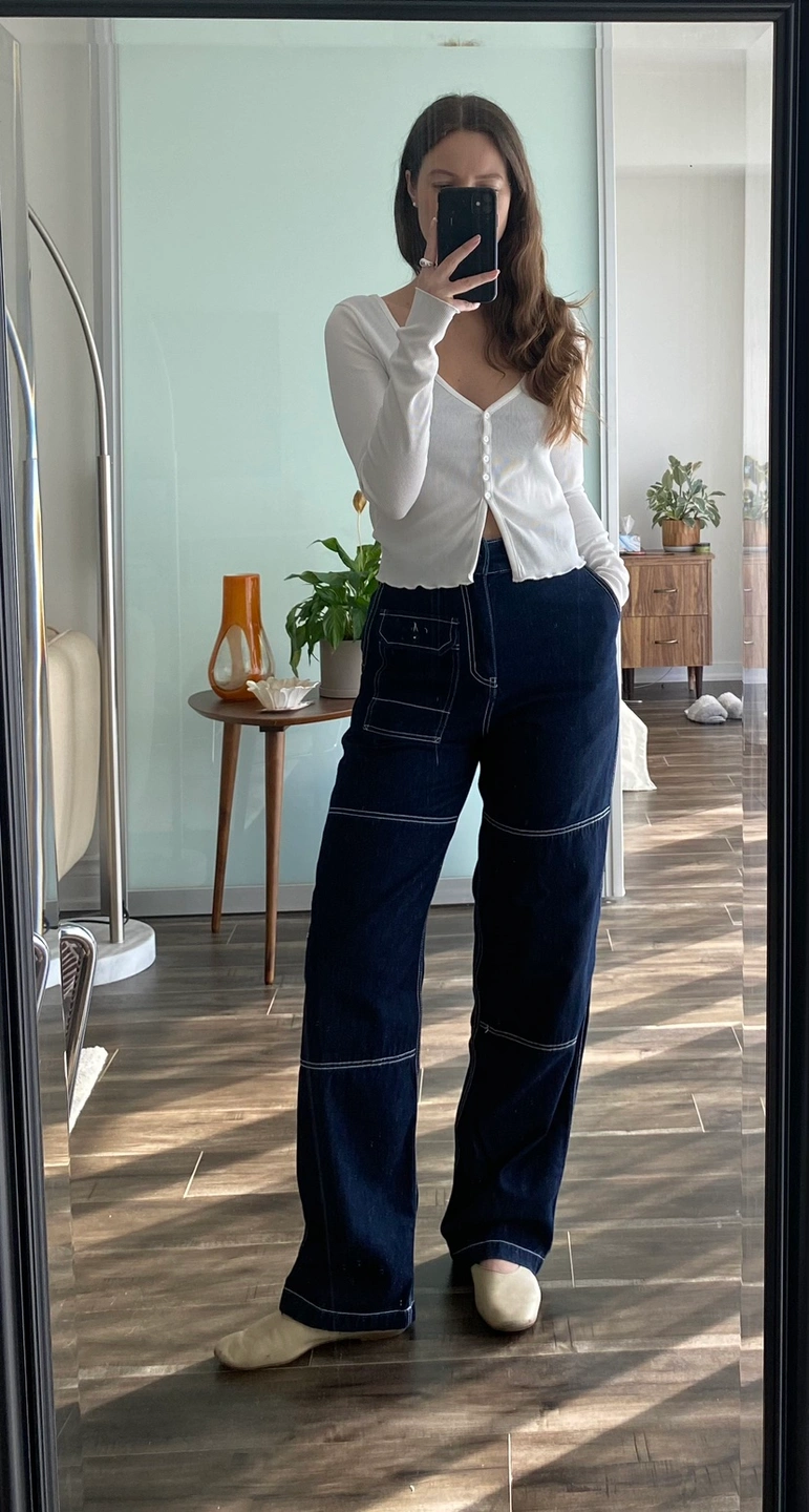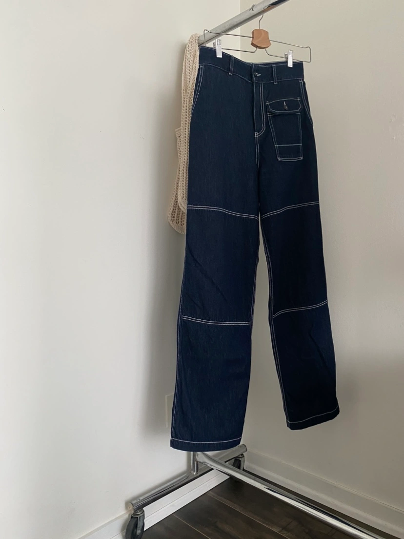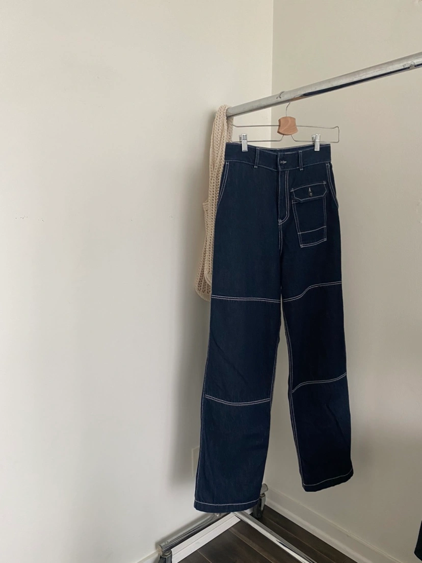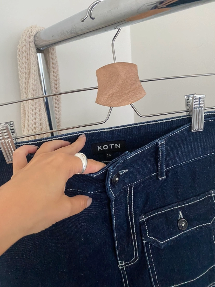 Kotn Manzala Pant. Size 26, dark wash blue denim jeans with white contrast stitching.