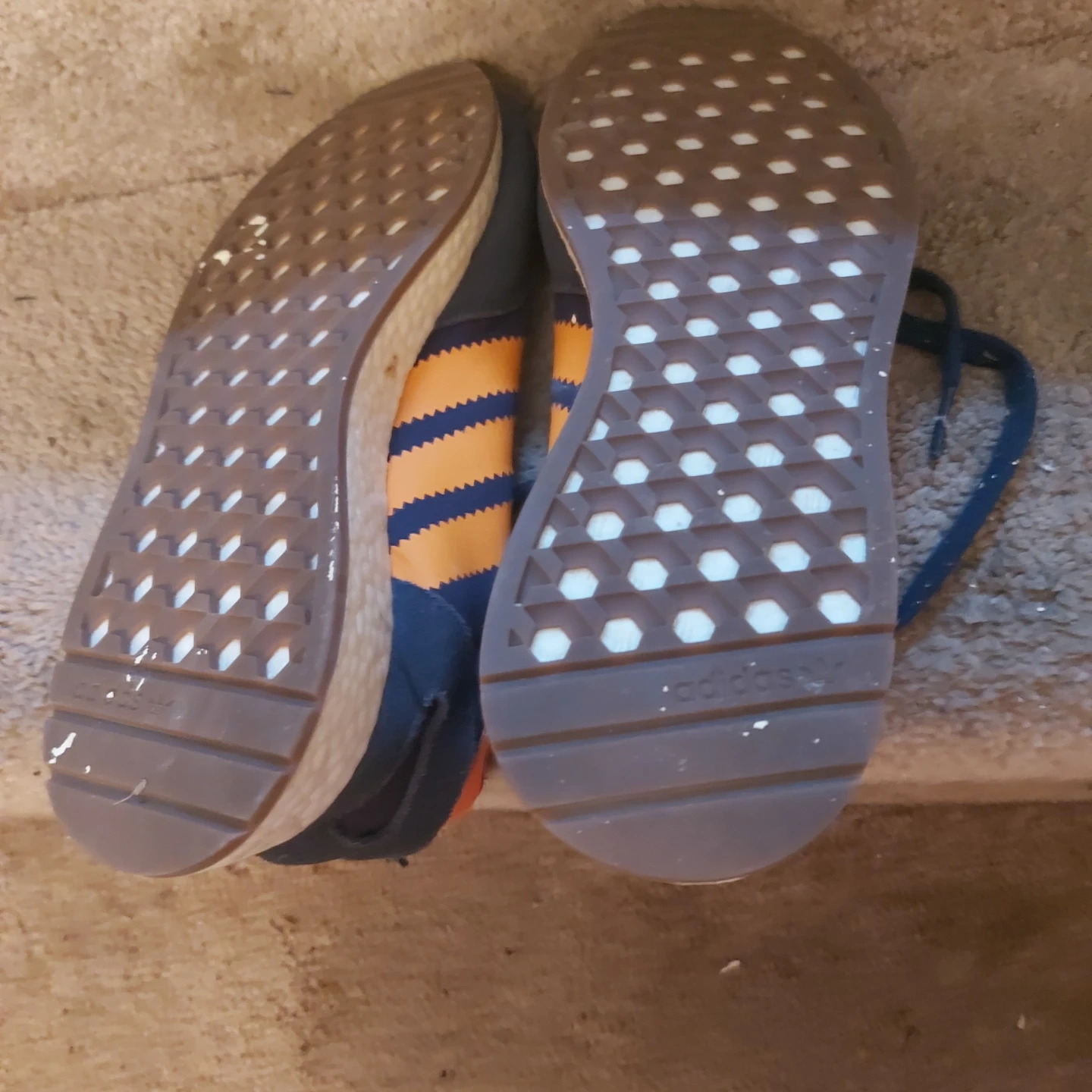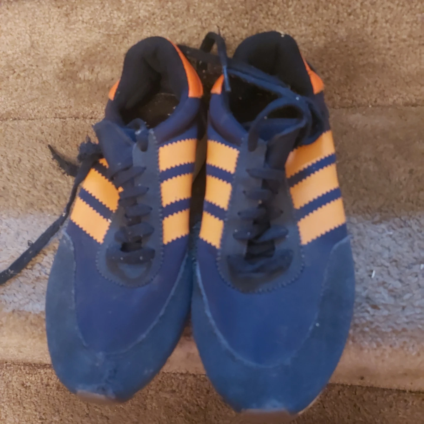 These Adidas running shoes are a size 9.5 in a blue and orange colourway. They feature a durable rubber sole with a distinctive grip pattern. A great pair for hitting the pavement!