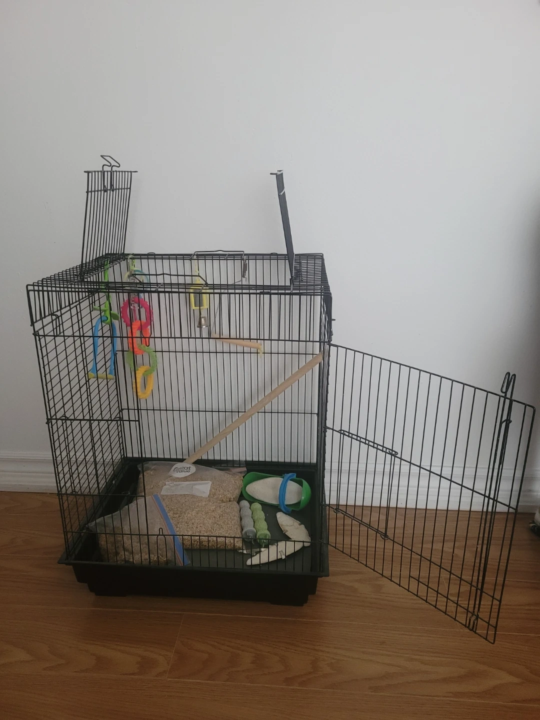 Black metal bird cage with a plastic base. Includes one bag of birdseed, a cuttlebone, a green food dish, and several hanging toys. It's suitable for birds like parakeets or finches. Ready for a new feathered friend!