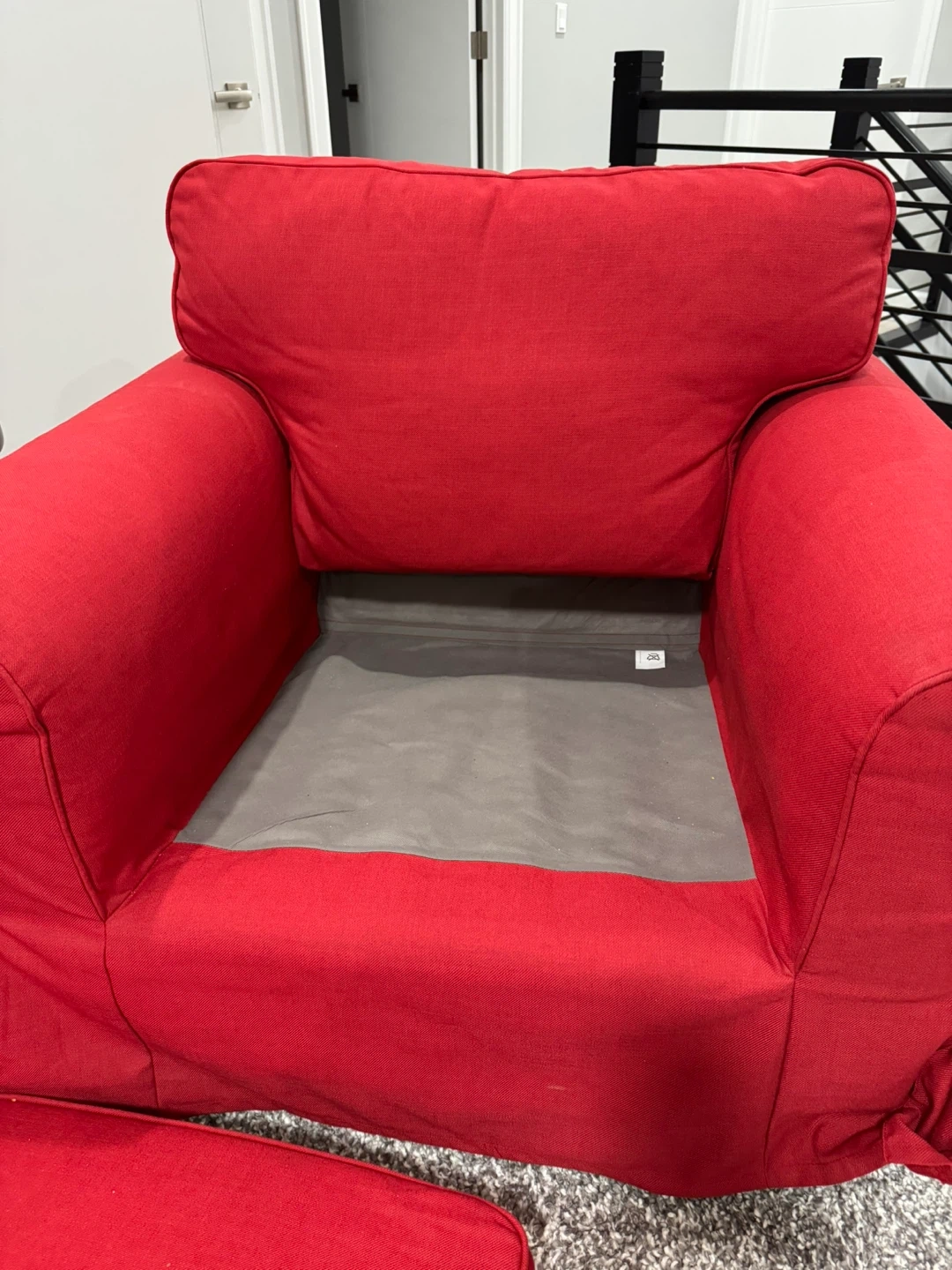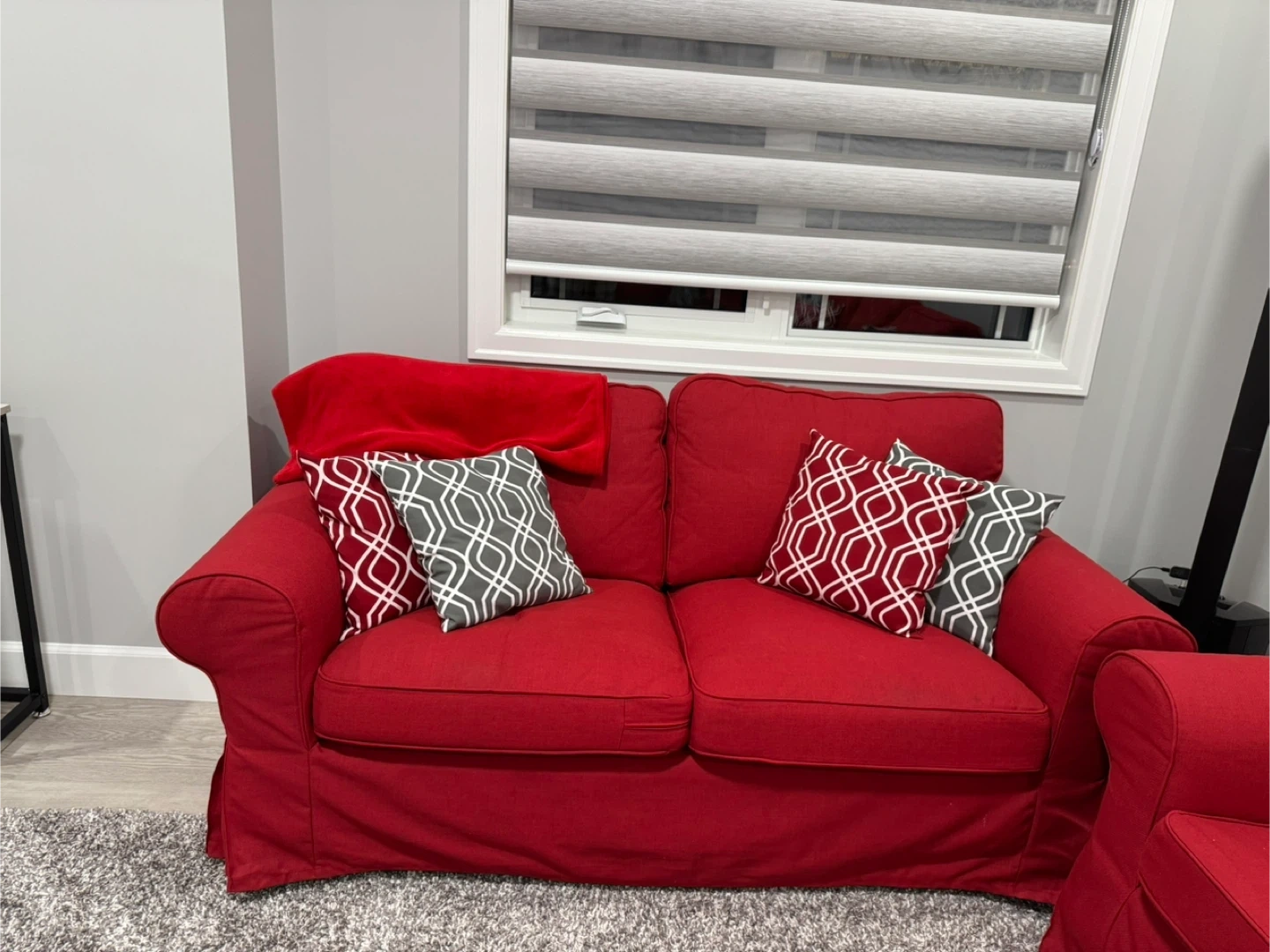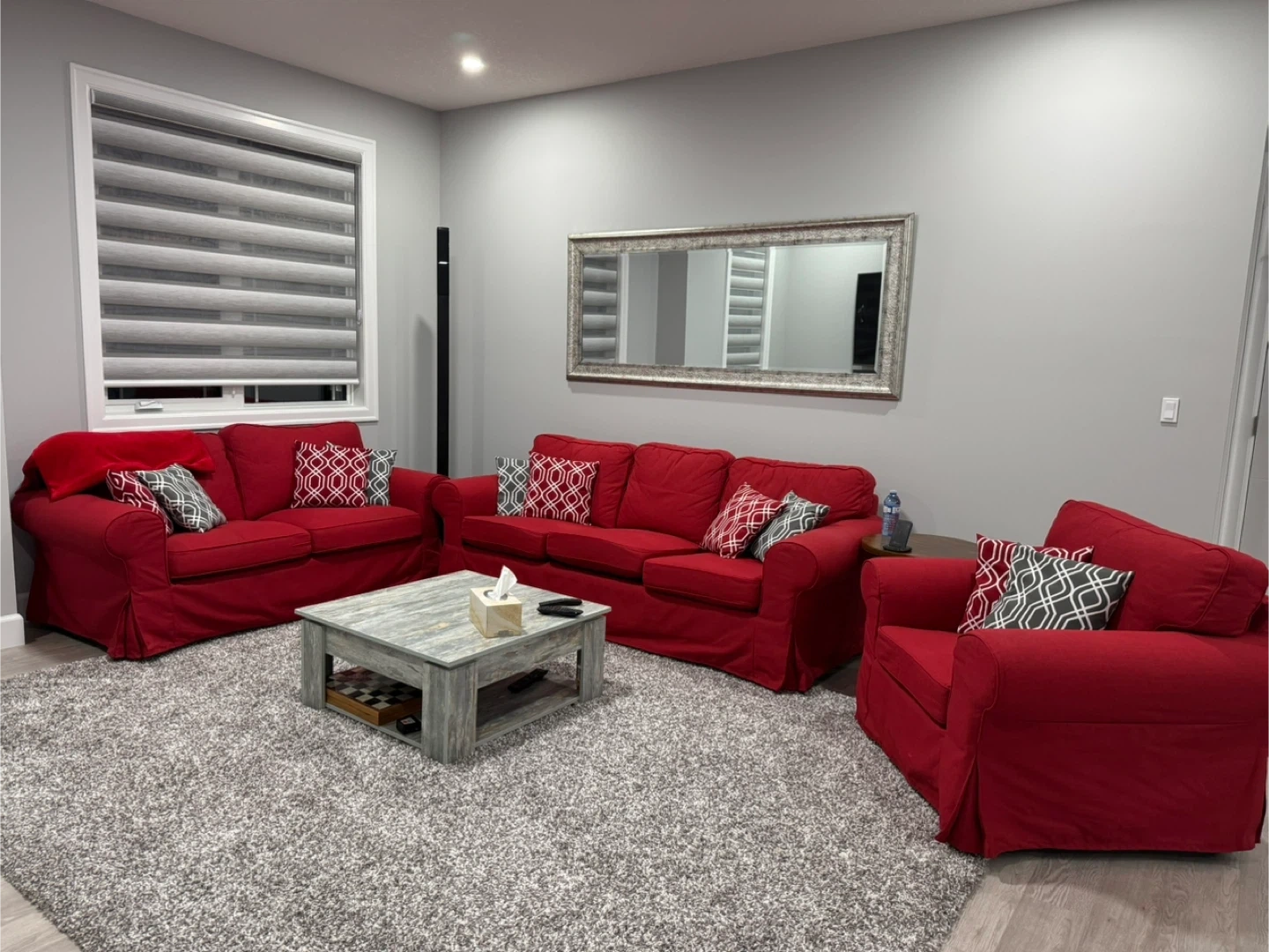 Comfortable red 3 piece sofa set featuring a removable slipcover for easy cleaning. This set offers a 3 seater sofa, 2 seater love seat, and a chair. It also comes with 10 decorative throw pillows in red and light grey. Great for adding a pop of colour to any room! It has not been used a lot. Looks and feels great. Pick up only from Airdrie SW. Coffee table is not included.