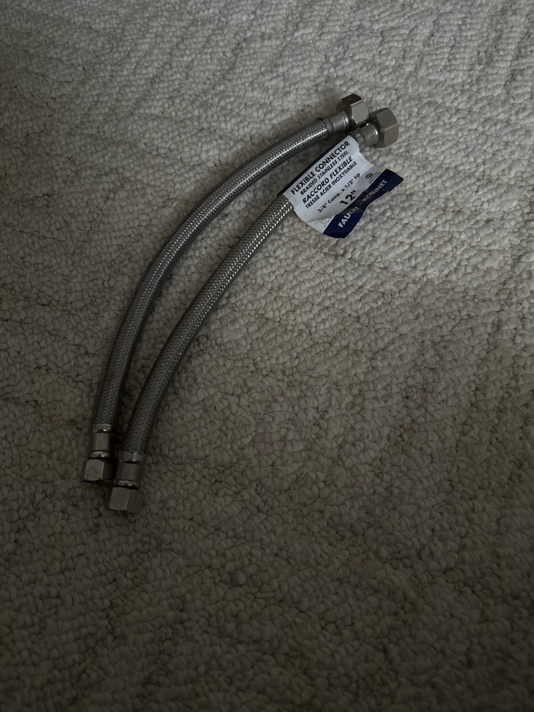 Two flexible braided stainless steel faucet connectors. Each is 12 inches long with 3/8" Comp. x 1/2" FIP connections. They're made of durable, non-oxidizable braided stainless steel.