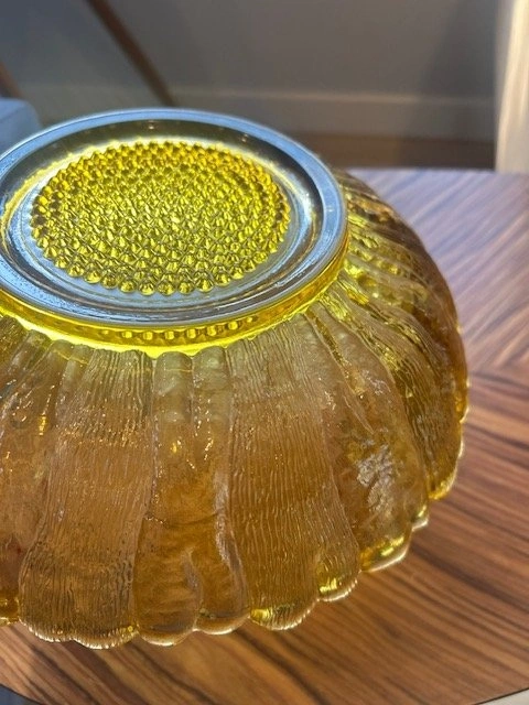 Beautiful vintage amber pressed glass bowl from the mid-century era, featuring a scalloped rim and radiating petal/sunburst design. Made in the style of Indiana Glass and LE Smith, this piece is unmarked, as was typical for many of these pieces from the 1950s-1970s. Excellent vintage condition. Approx. 10.5" diameter and 1.3kg weight. Pick up Port Moody or UBC.