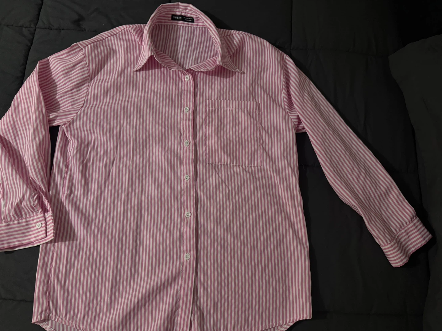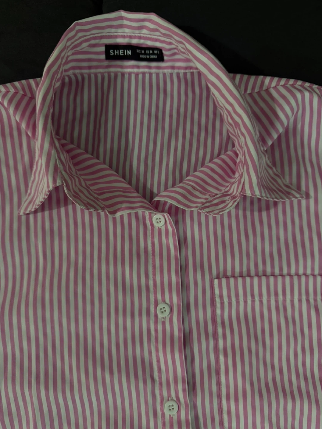 A classic pink and white striped button-up shirt from SHEIN. It features a breast pocket and a collared neckline. Made from lightweight fabric, it's a comfy addition to any casual wardrobe. Size is medium.