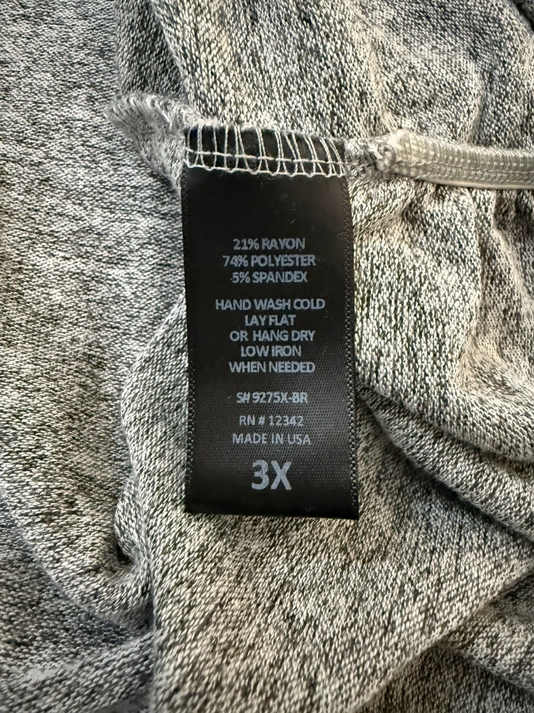 COIN 1804 grey cowl neck sweater. It's a size 3X and made from 74% polyester, 21% rayon, and 5% spandex. This sweater is made in USA. It's comfortable for casual wear.