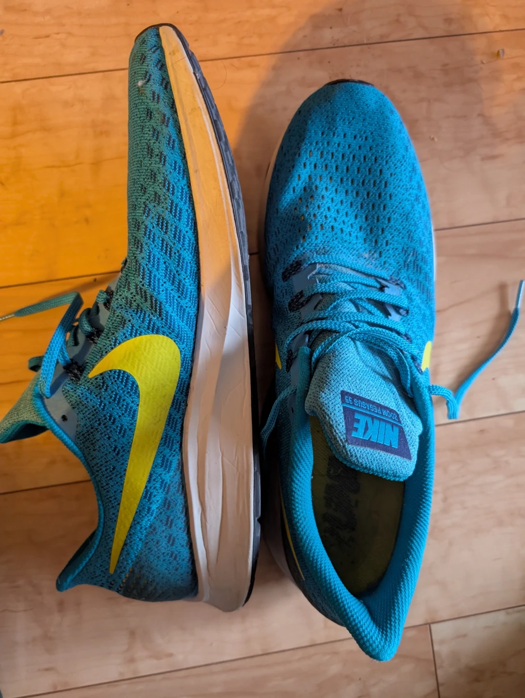 These are Nike Zoom Pegasus 35 running shoes(Size13) in a turquoise and yellow colourway. They're designed for comfort and performance on your runs. Mesh upper for breathability.