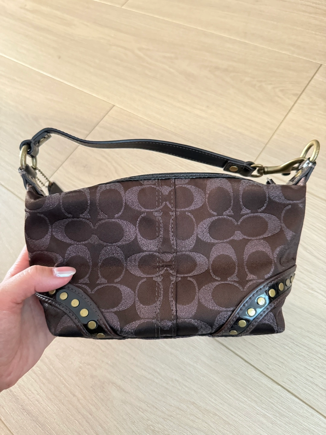 Selling a cute Coach mini bag in a brown monogram pattern! It's in great condition and perfect for carrying your essentials. The bag features a stylish design with studded detailing and a comfortable handle. It's a great addition to any outfit!