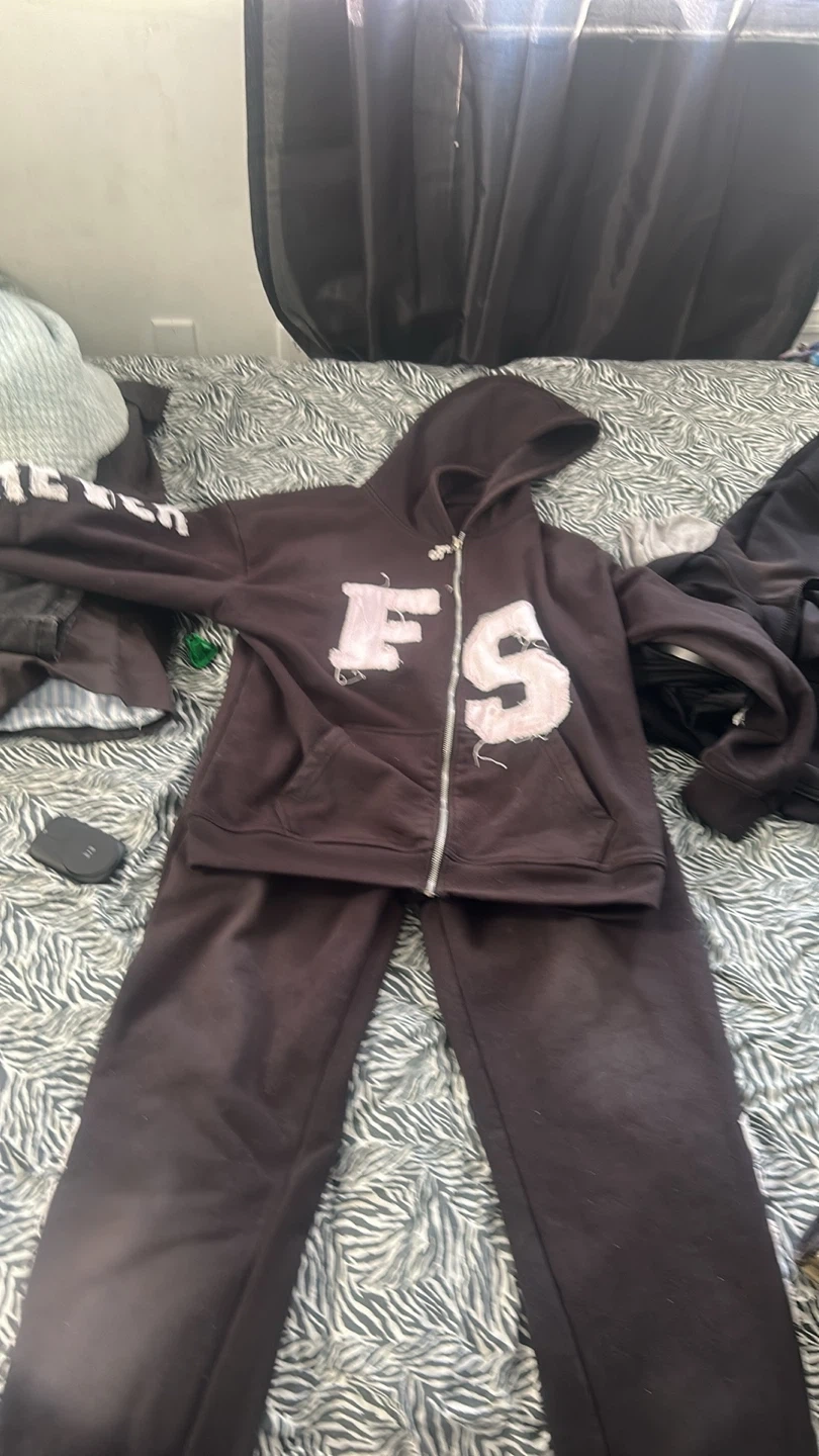 Selling a black matching set with an 'FS' design on the hoodie. The set includes a zip-up hoodie and matching pants. It appears to be in good condition, perfect for casual wear! open to trades hmu