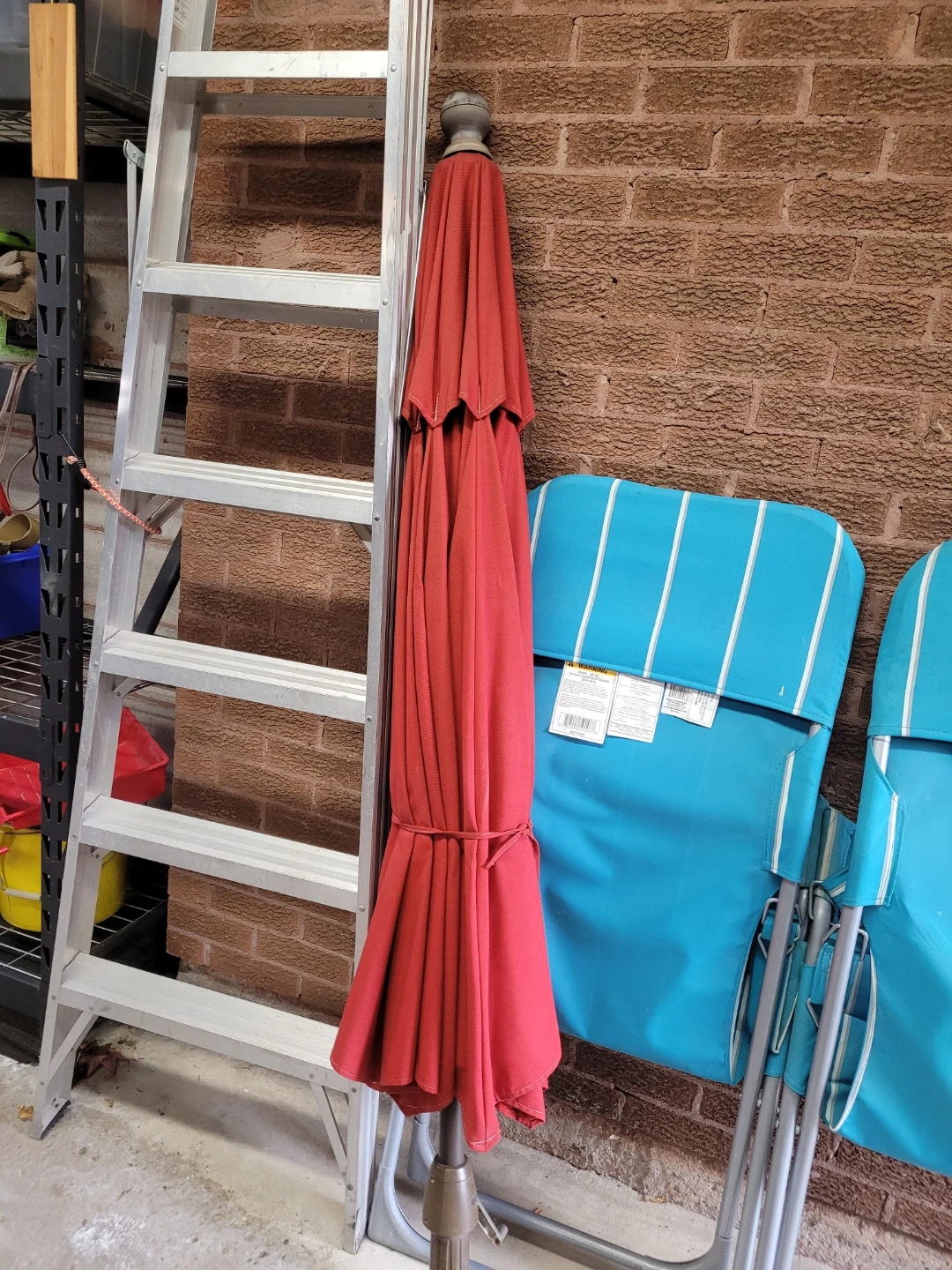 Classic red Adirondack chair for your patio or backyard. Includes a matching red patio umbrella and a sturdy umbrella base. Perfect for relaxing outdoors!