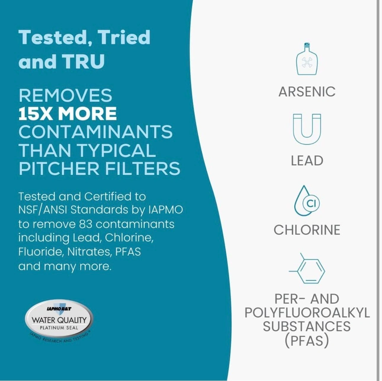 Tested and certified by IAPMO according to NSF/ANSI standards to remove 82 CONTAMINANTS - that's 15X more contaminants than the leading pitcher filters. Removes such toxins as Lead 99.1%, Chromium 97.2%, Copper 95.2%, Fluoride 93.5%, Radium 96.4%, and Chlorine 96.6% (to name a few). In fact, it's designed to remove 1000's of pollutants that could be lurking in your tap water. Taste the Difference!
