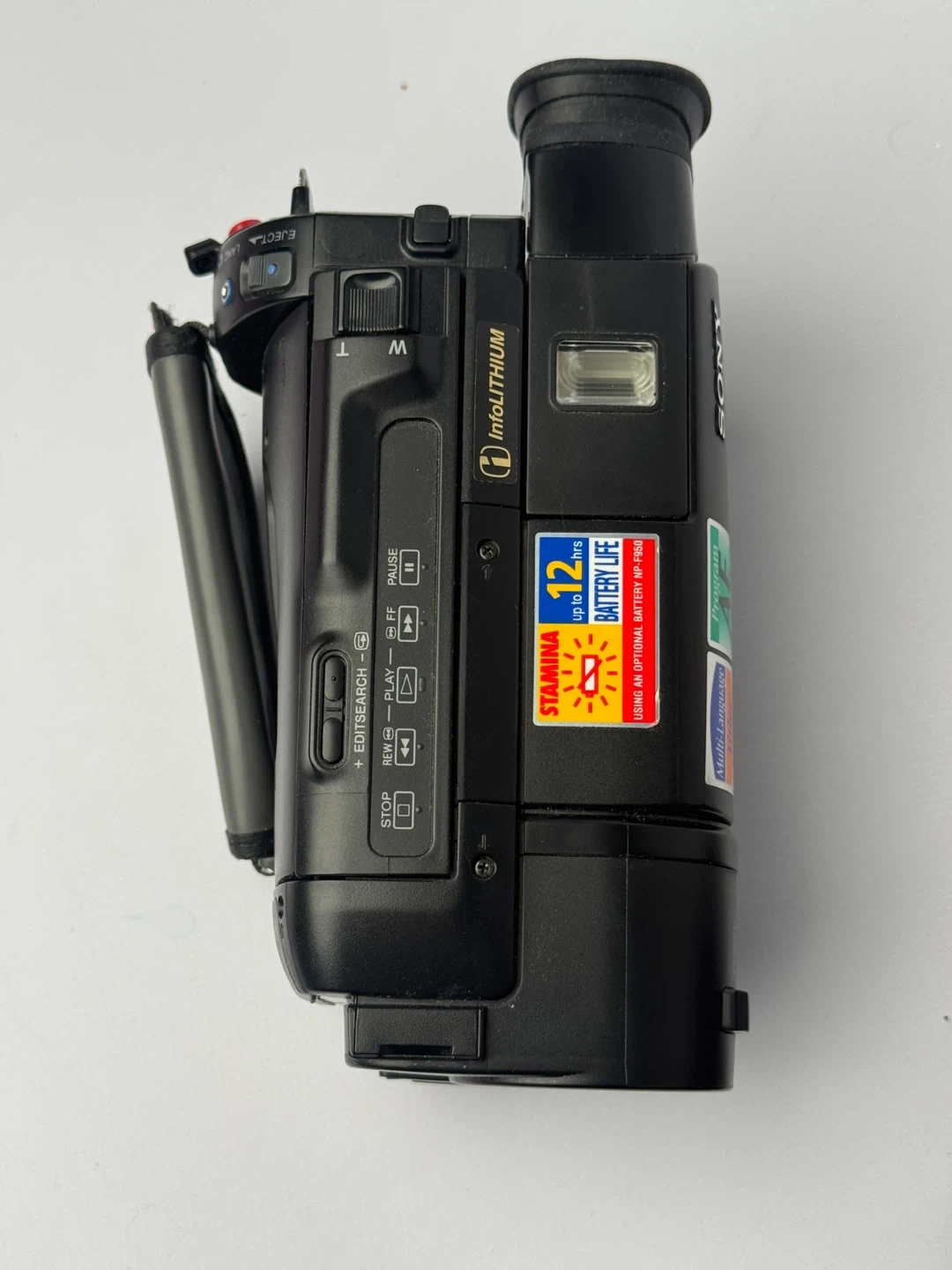 Black Sony Handycam camcorder. Features 32x optical zoom and 0.4 Lux low-light capability. Includes the "Stamina" InfoLithium battery system for extended recording. A great way to capture memories on tape!