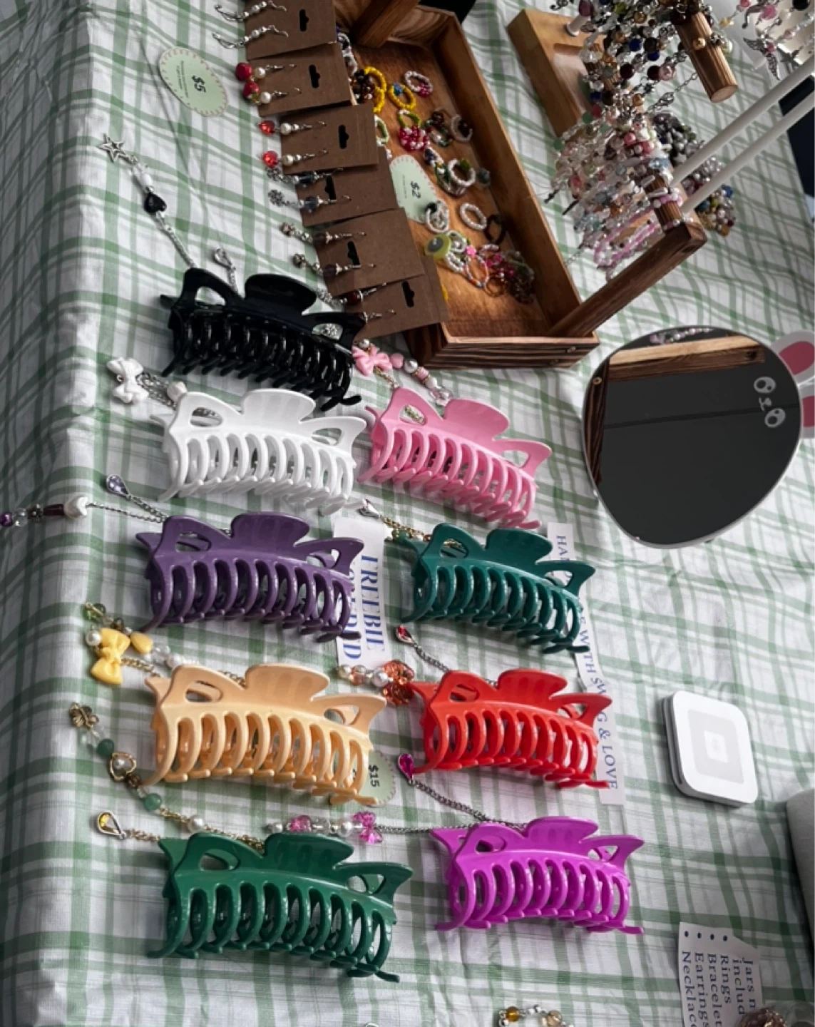 Set of colourful large hair claw clips, each decorated with a beaded charm. Available in black, white, pink, purple, green, beige, red, and dark pink. These clips are great for holding back hair securely.