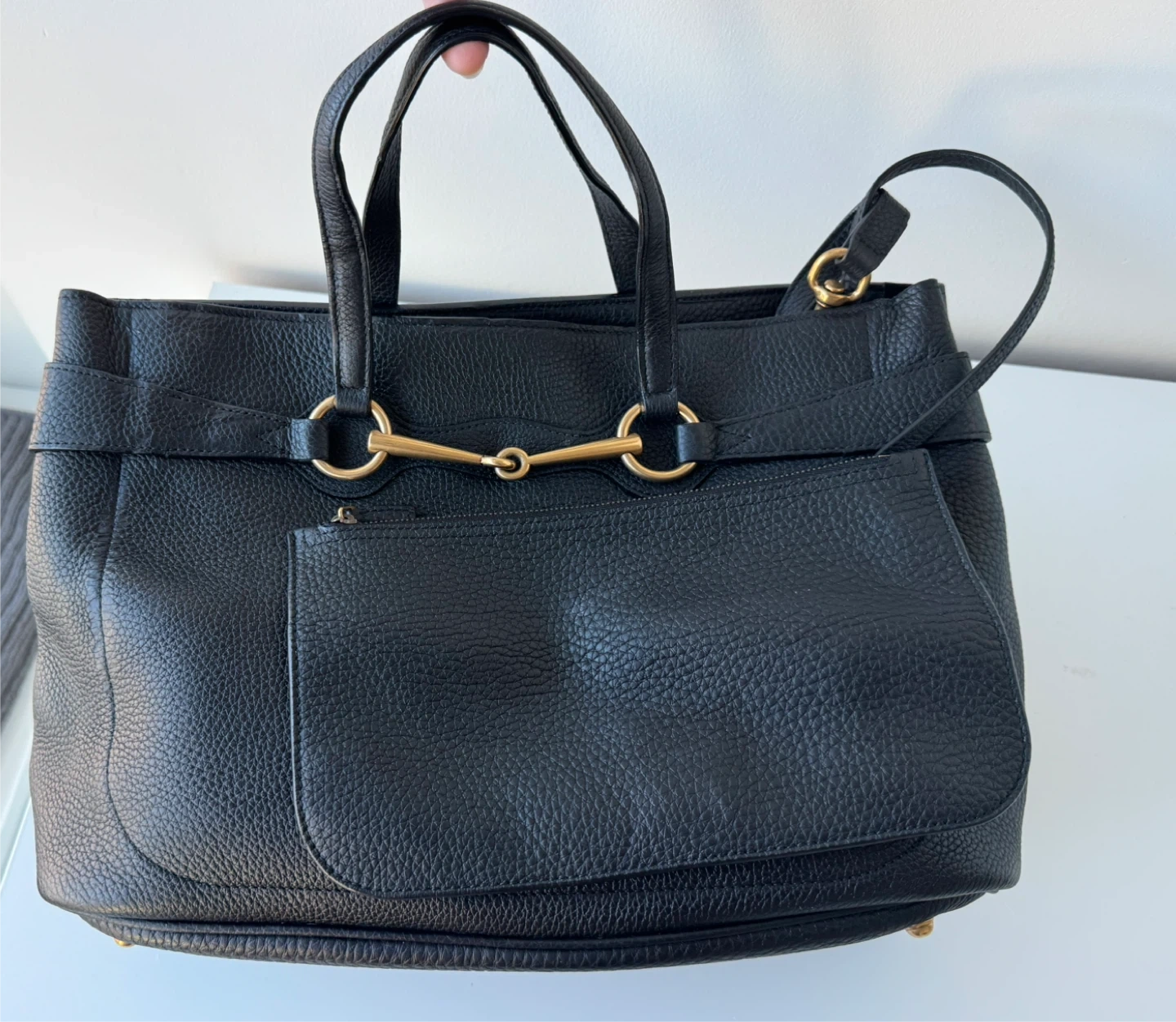The Bright Bit satchel features a calf leather body, flat leather handles, a detachable flat leather strap, an open top with magnetic snap closure, two interior zip compartments, and a zip pouch. VINTAGE!