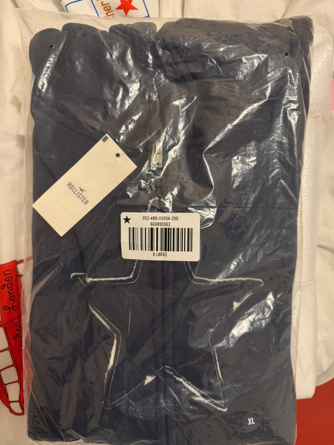 This is a navy blue Hollister zip-up hoodie in size extra large. It features a white star design on the front. It's still in its original packaging.