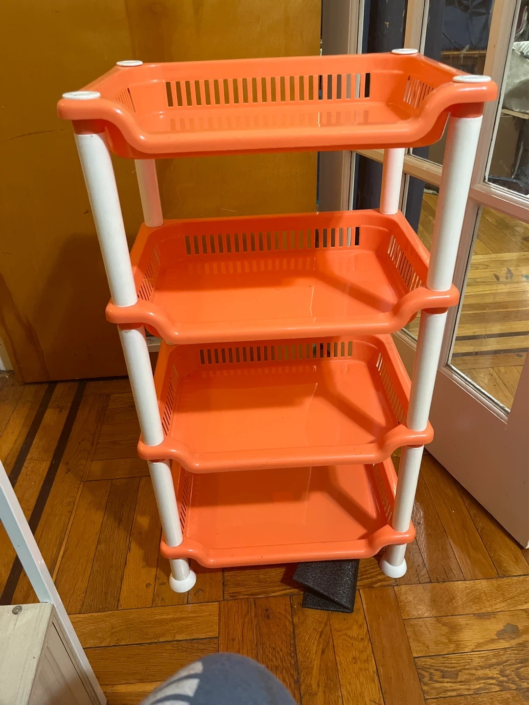 Buy & SellOrange 4-Tier Plastic Storage Shelf RackOrange 4-Tier Plastic Storage Shelf Rack$15Orange 4-tier plastic storage shelf rack with white poles. Great for organizing any space! Plastic construction.WHERE TO MEETCheck LocationView MapSELLERShaistaHomecrest10310 reviews0 chats·0 favorites·8 viewsSEND CHAT TO SELLERHi Shaista! I’m interested in your listing.Hi Shaista! I’m interested in your listing.Get the Karrot app to chatSign In to chat