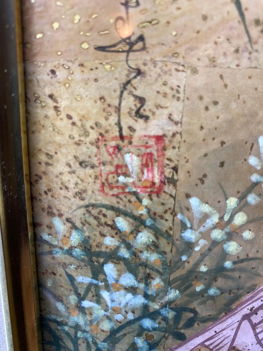 Selling a framed painting piece of Asian art. It depicts a woman with a fan in a garden setting. The frame is gold-colored and has a bamboo-like design.