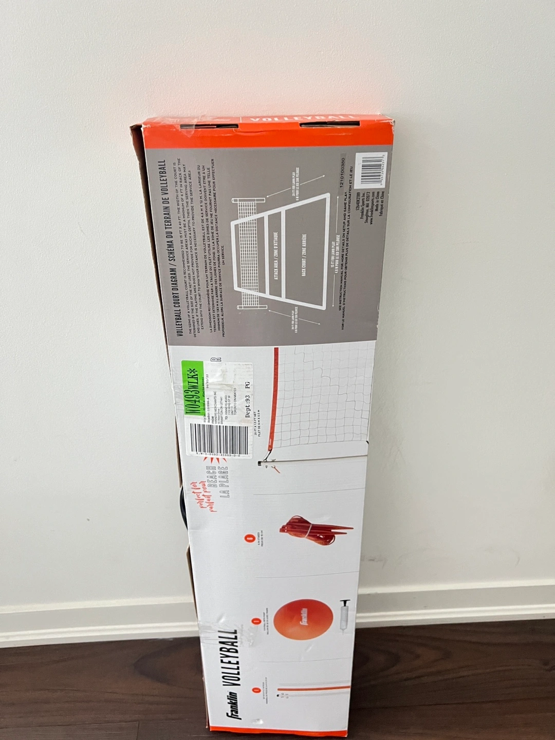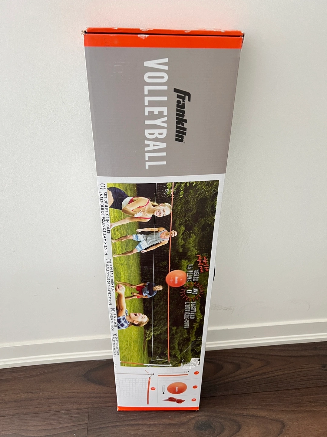 New in box. Includes net, poles and ball. Great for backyard fun. Easy setup.