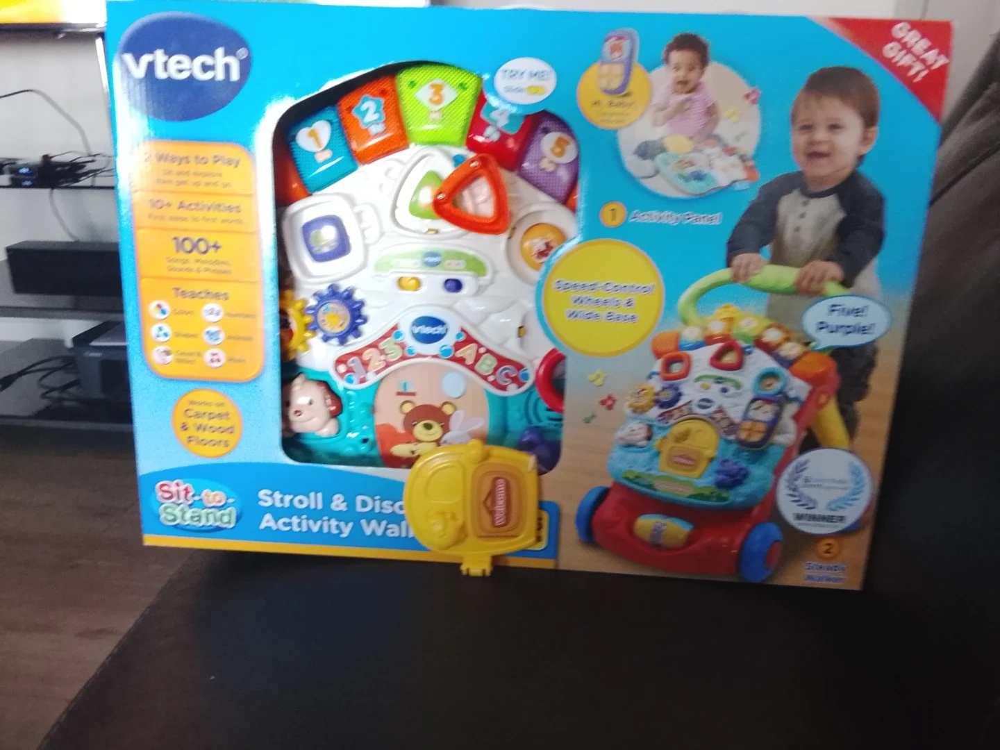 This VTech Sit-to-Stand Activity Walker offers two ways to play: sit and explore or stand and go. It includes 10+ activities and teaches first words, sounds, and music. It works on carpet and wood floors!