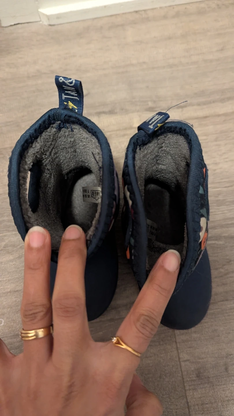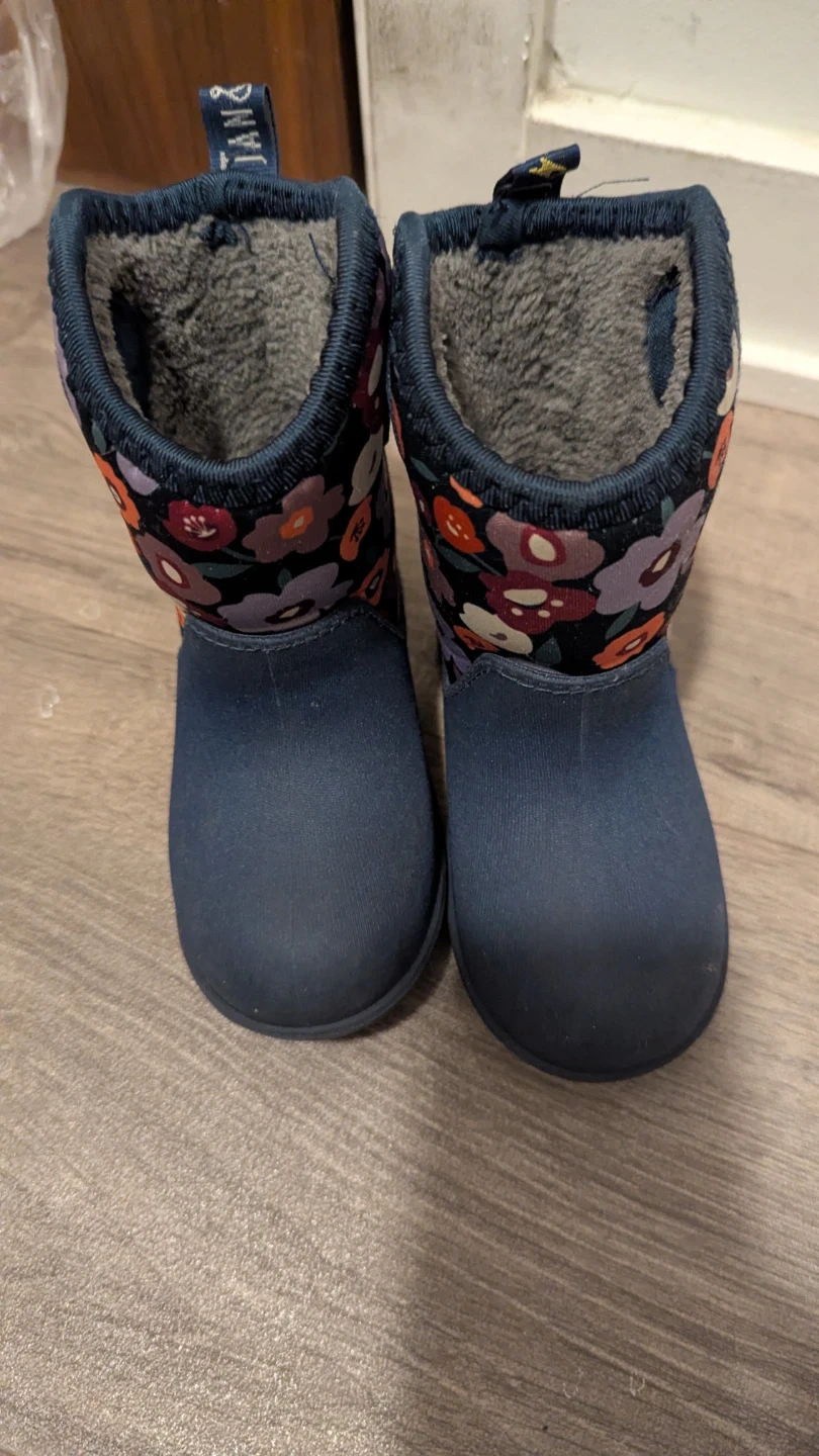These cute Bogs kids boots are a size 7! They feature a fun floral pattern and are lined with cozy material to keep little feet warm.