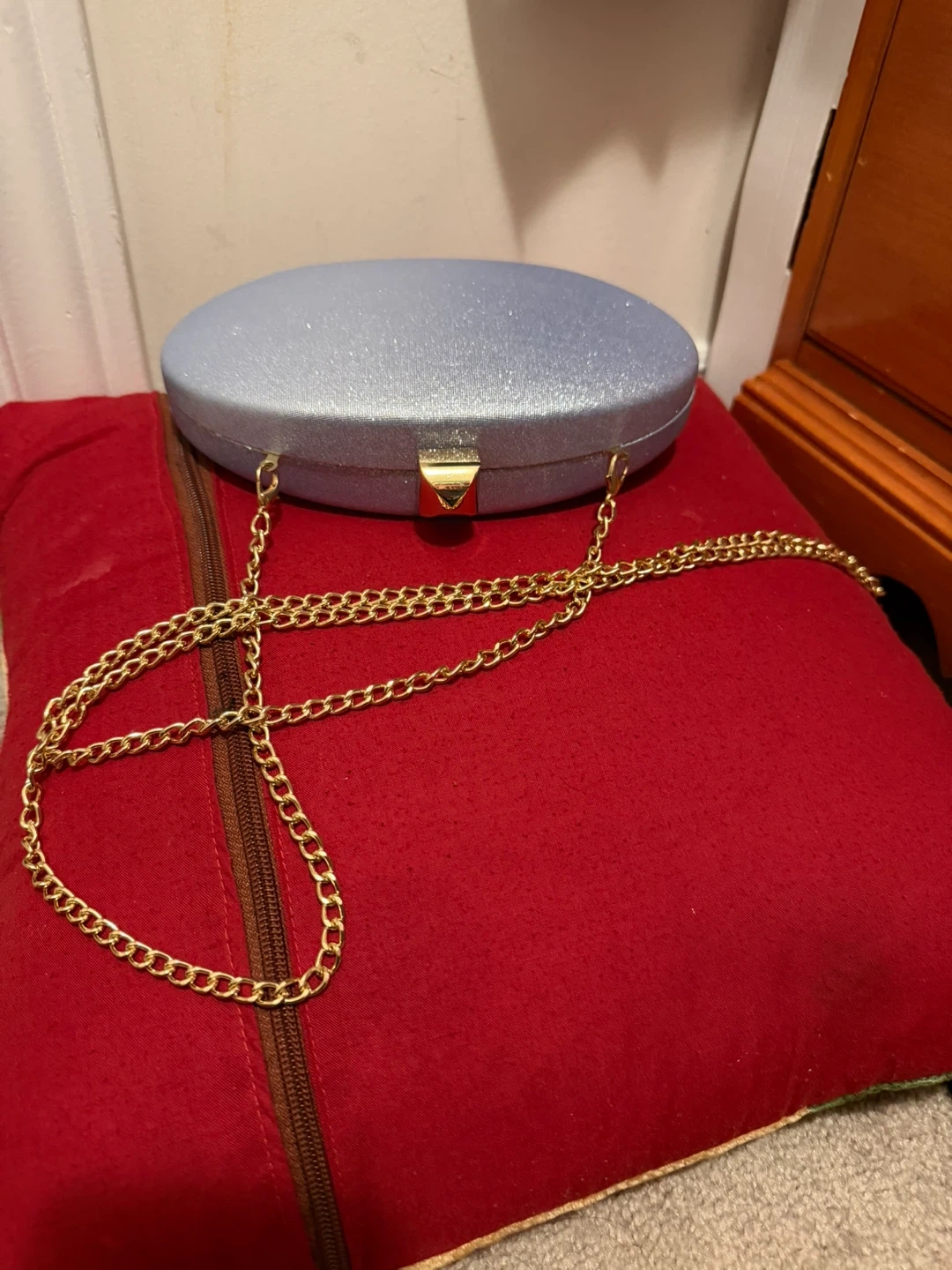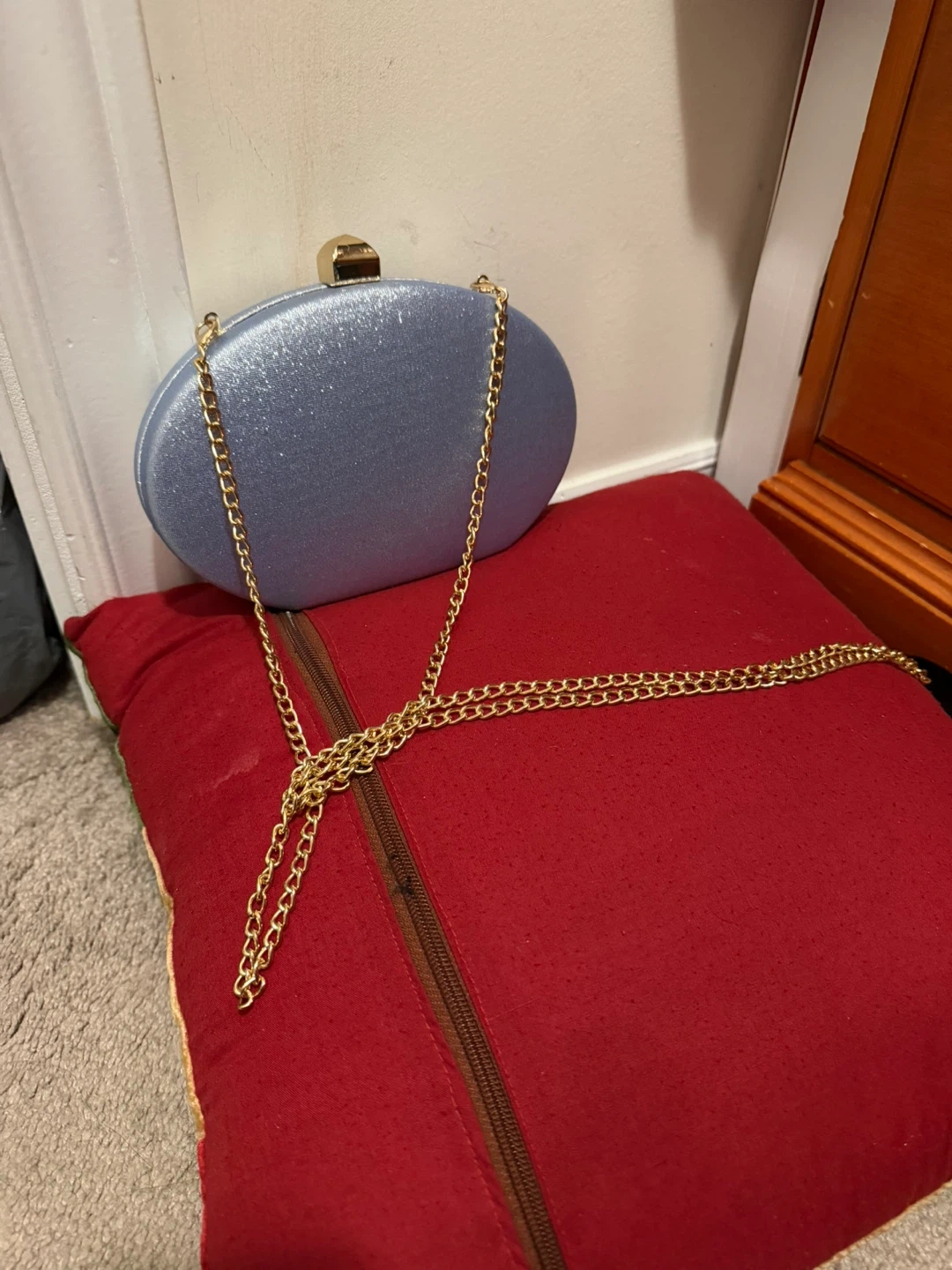 This clutch is a lovely light blue with a subtle glitter finish. It comes with a detachable gold chain strap for versatility. Perfect for evenings out or special occasions! Hardly used