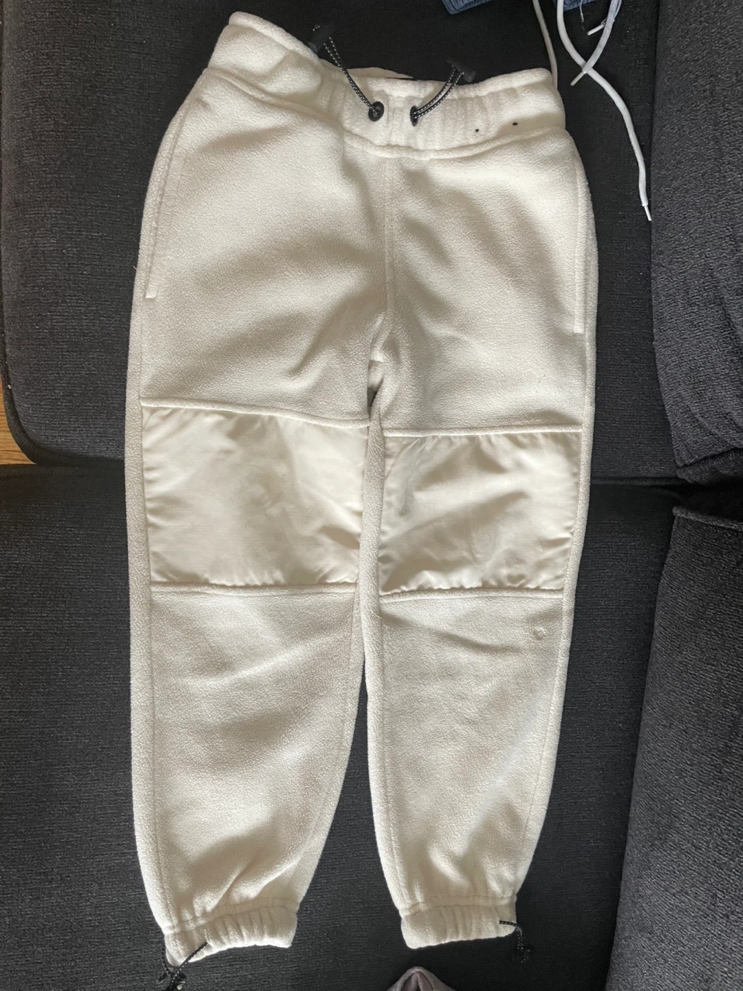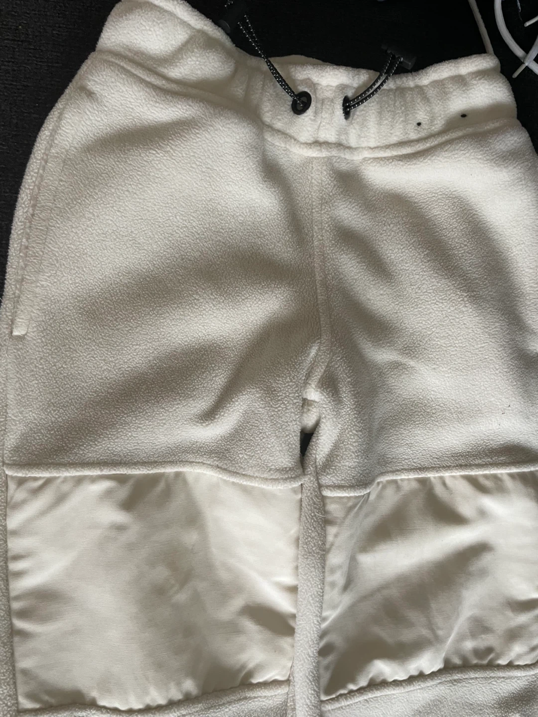 Cream-coloured fleece joggers with reinforced hoodie. Includes a drawstring waist and elasticated cuffs. Size XS/TP (5/6).