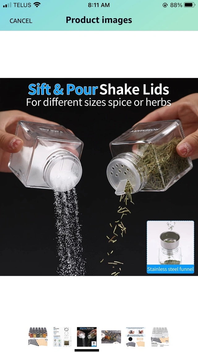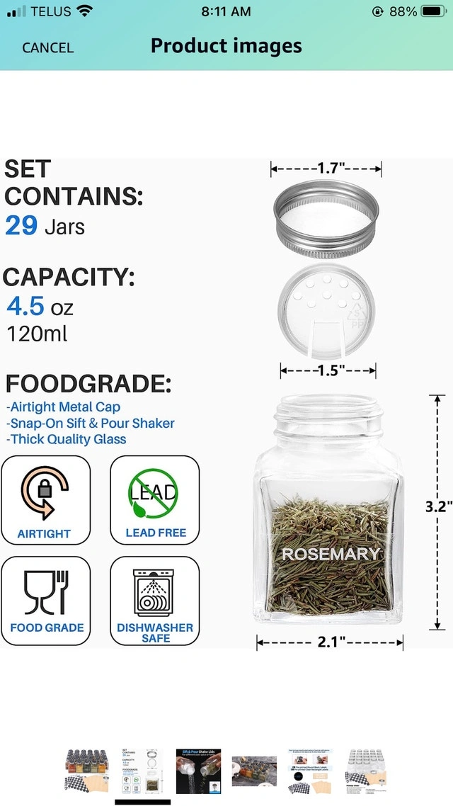 Selling 9 glass spice jars. 120ml/ 4.5 oz Brand new .Never been used. I bought a set and only need a few of them.