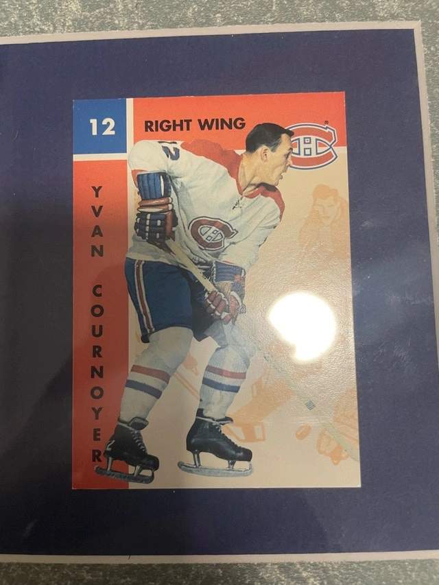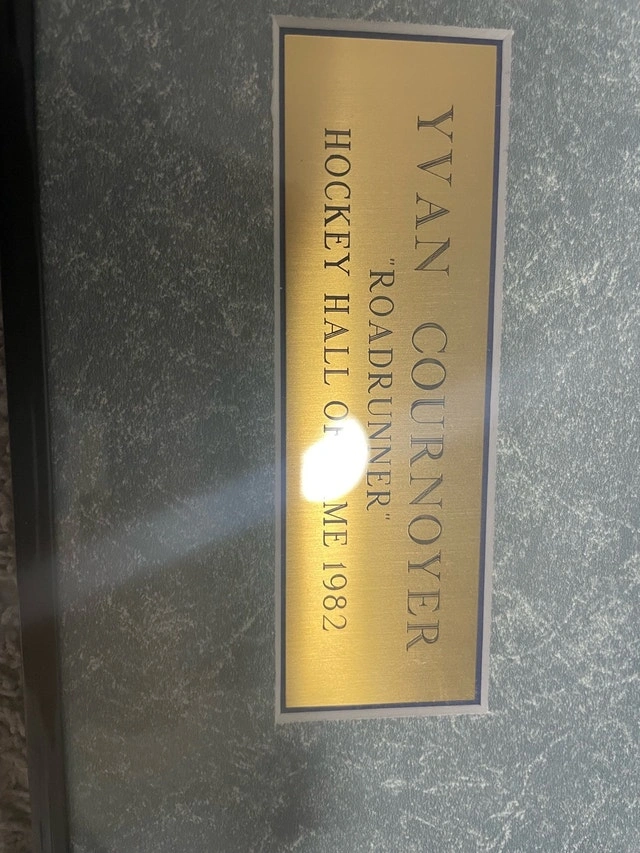 Selling a framed Montreal Canadiens collectible featuring Yvan Cournoyer. This piece includes a classic action photo, a commemorative plaque (Hockey Hall of Fame 1982), a vintage-style hockey card, and a badge, all professionally displayed in one frame. Perfect for hockey fans or collectors, especially supporters of the Canadiens. The frame is in good condition and makes a great wall piece for a room, office, or sports setup.
