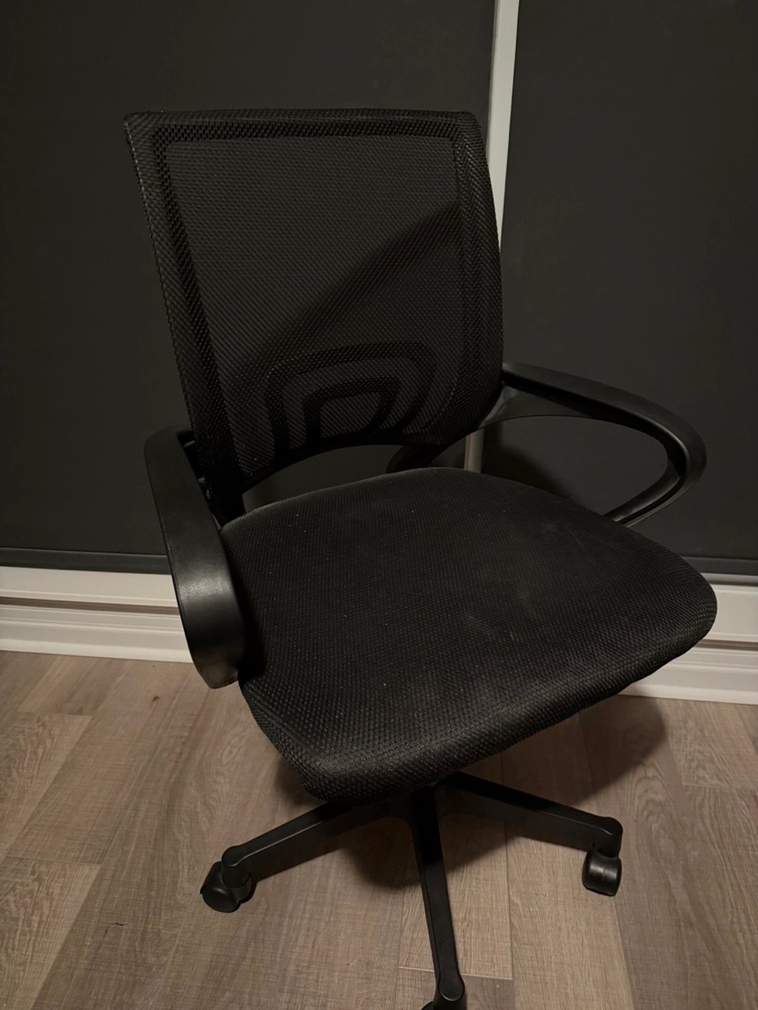 This is a black mesh office chair with adjustable arms and a rolling base. It features a breathable mesh back and a padded seat. Perfect for any home office setup!