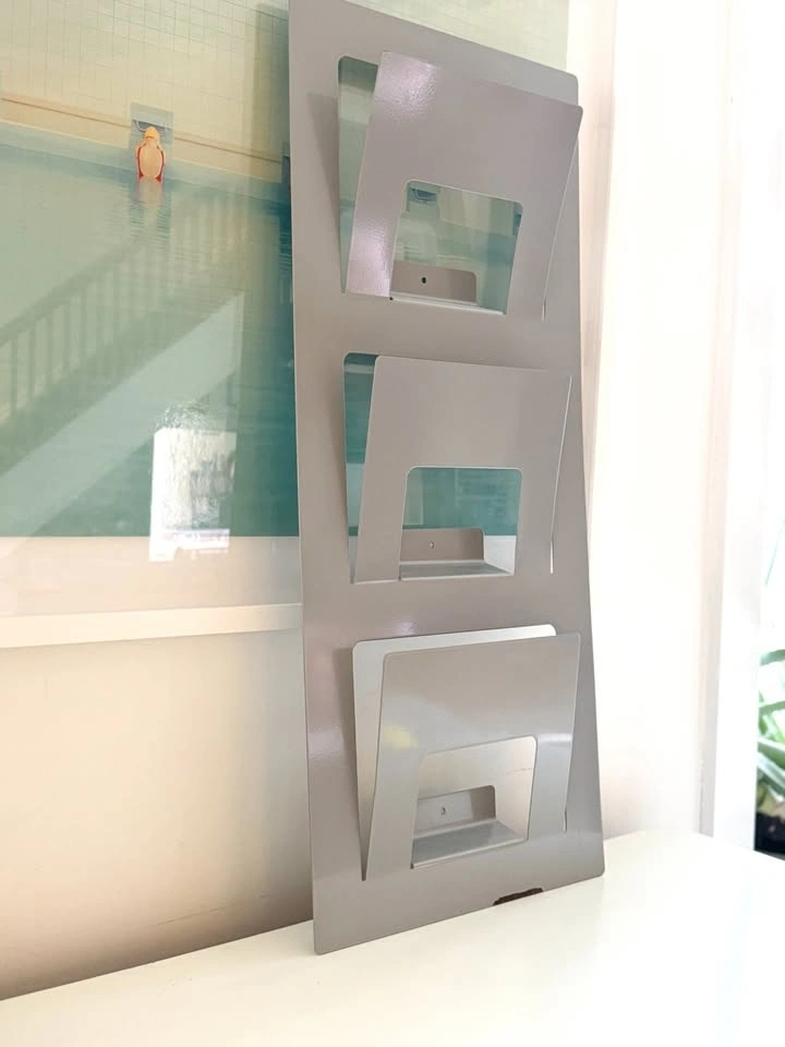 The rack features three pockets, perfect for organizing magazines, mail, or documents. Its sleek grey metal finish will complement a variety of decor styles, from retro and Y2K to modern and Scandinavian.