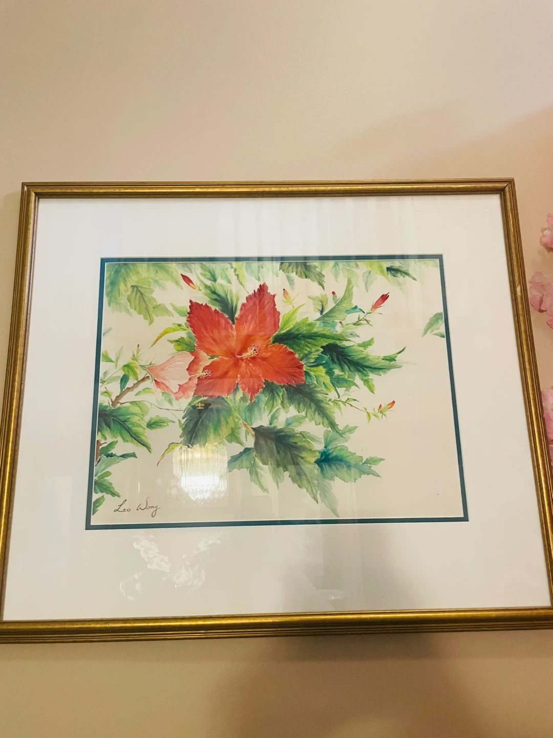 Original watercolour painting by Leo Wong titled "Hibiscus Blossom". The medium is watercolour on paper, with dimensions of 13 x 17 inches. Framed with a gold-tone border and matting.