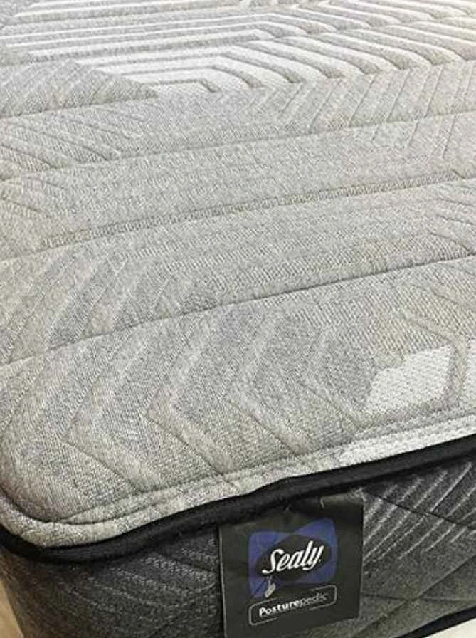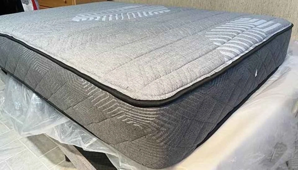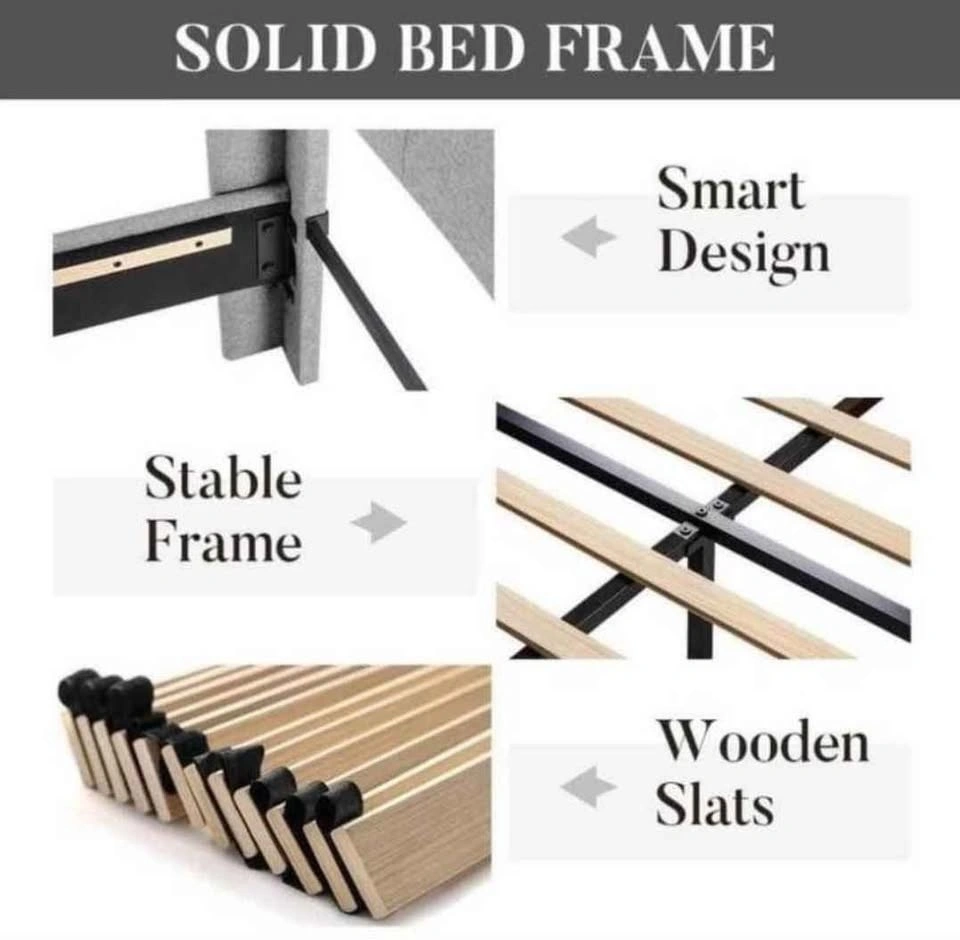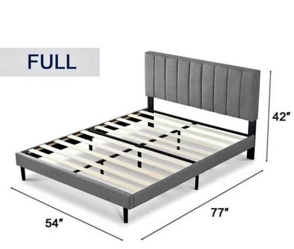 Stylish full size bed frame. Grey upholstered fabric with channel-tufted headboard. Has wooden slats for mattress support. Velcro design makes it noise-free. Frame stable with strong, tough slats. Dimensions 54 inches wide, 77 inches long, headboard 42 inches high. Double/full size Sealy Mattress is also available for an additional $250. Please see other listing for more details on Mattress.