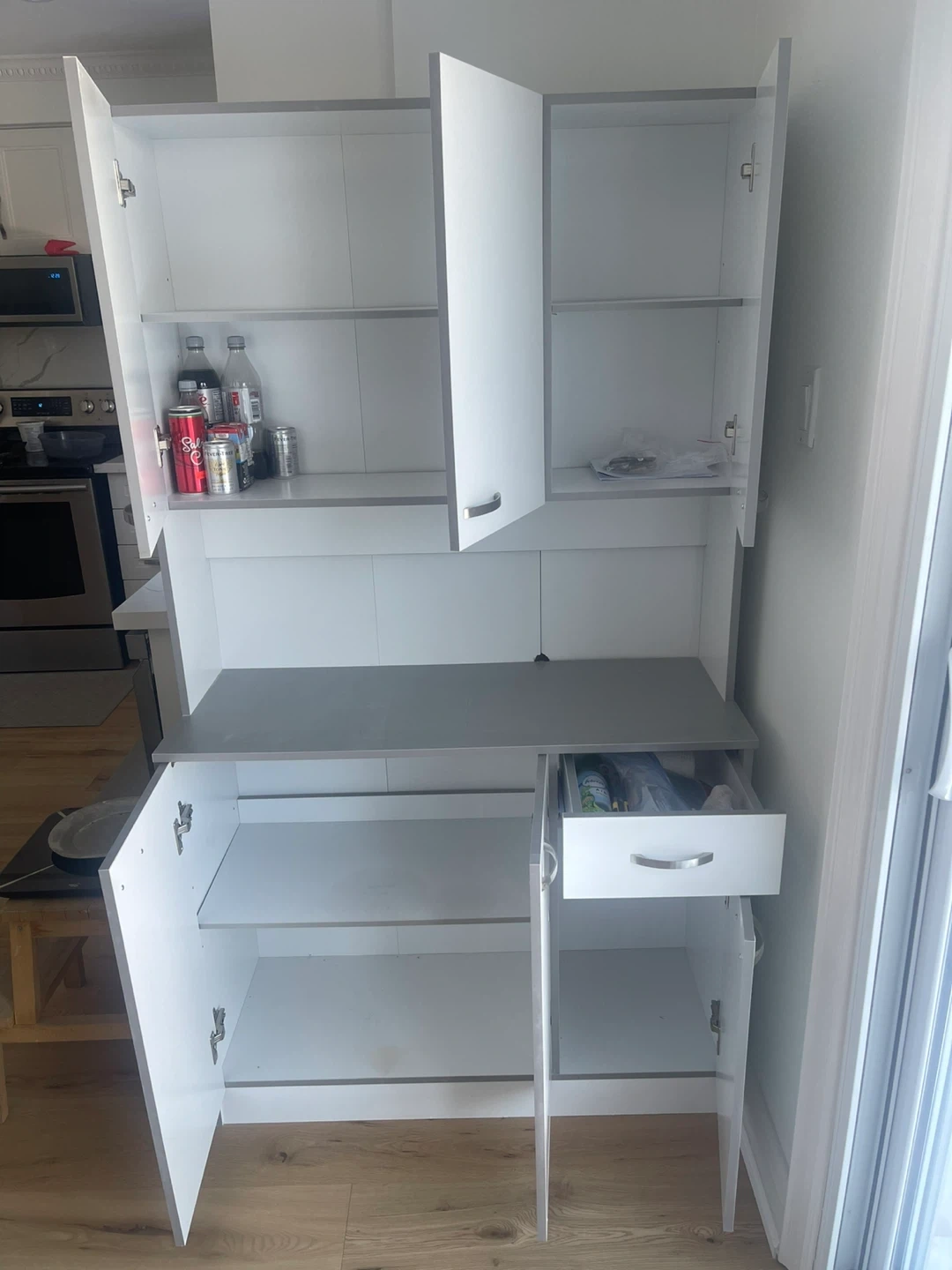 White storage unit with grey countertop. Features upper cabinets, a drawer, and lower cabinet doors. Plenty of space for kitchen essentials or other household items. It's a great way to organize your space!