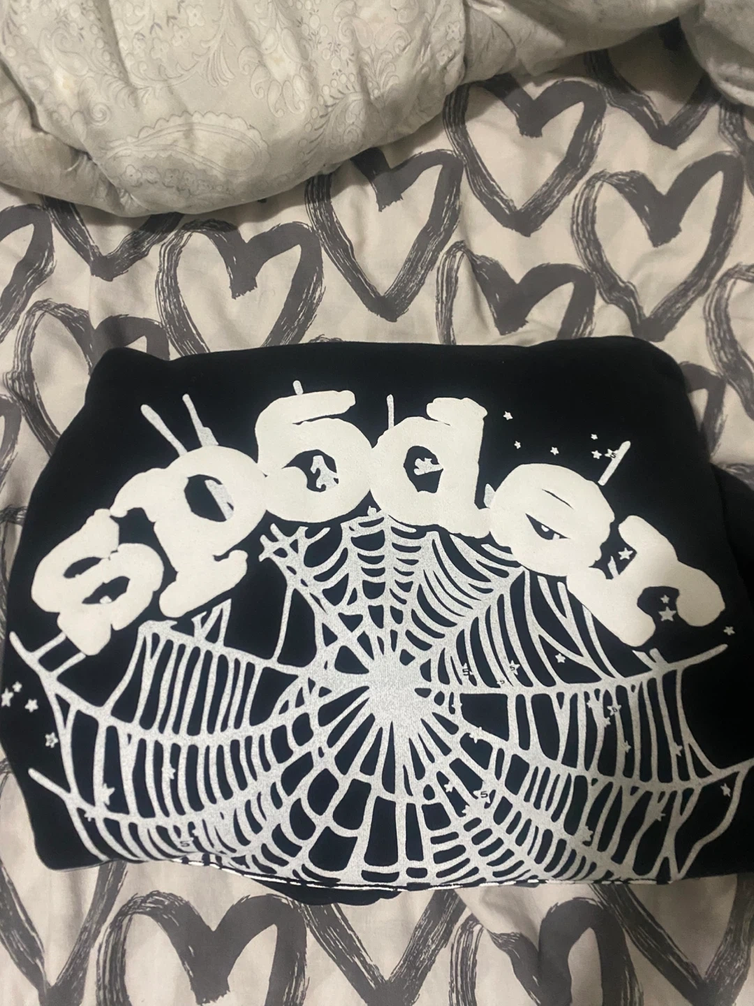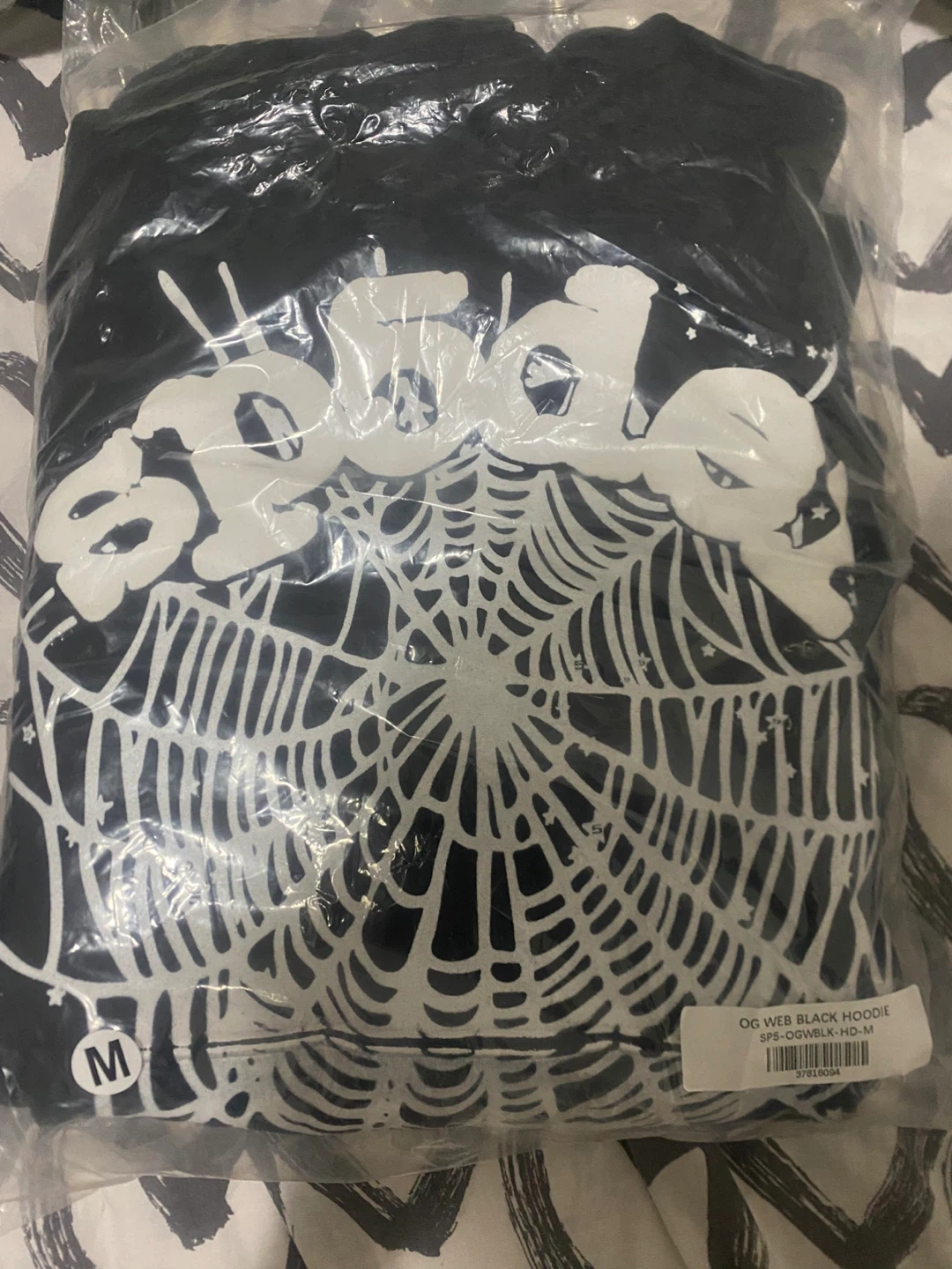 This is an OG Web Black Hoodie in size small and medium. It's still in its original packaging. The graphic features a spider web design with white lettering. 1:1