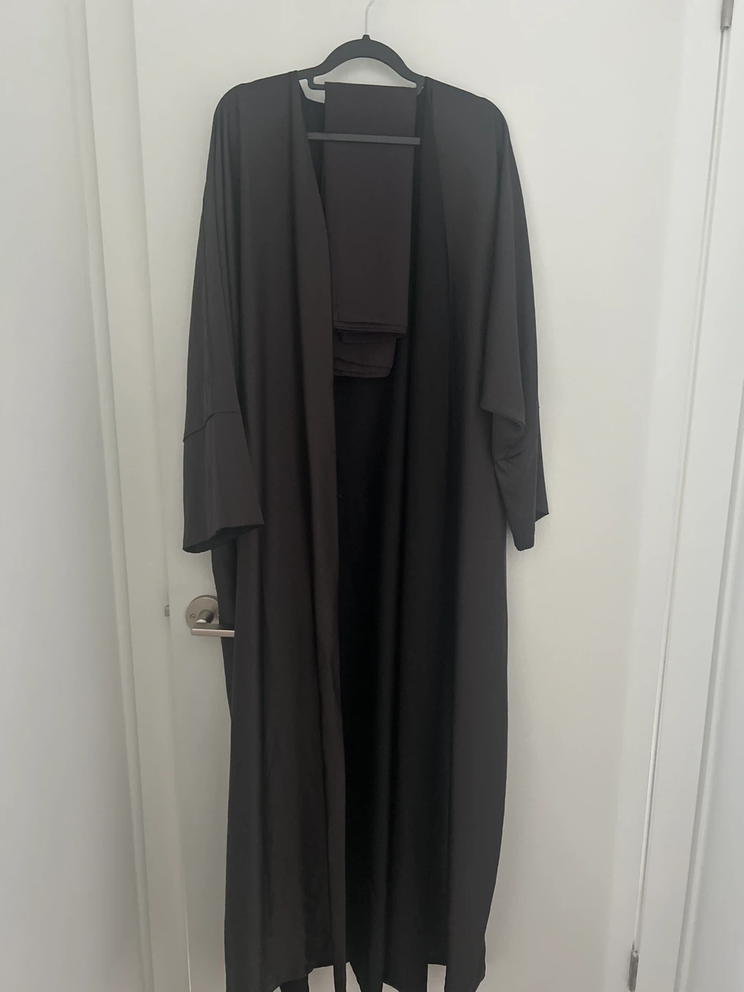 Black and grey double sided silk abaya and matching scarf set. This elegant abaya is made from a flowing fabric. It's suitable for various occasions.