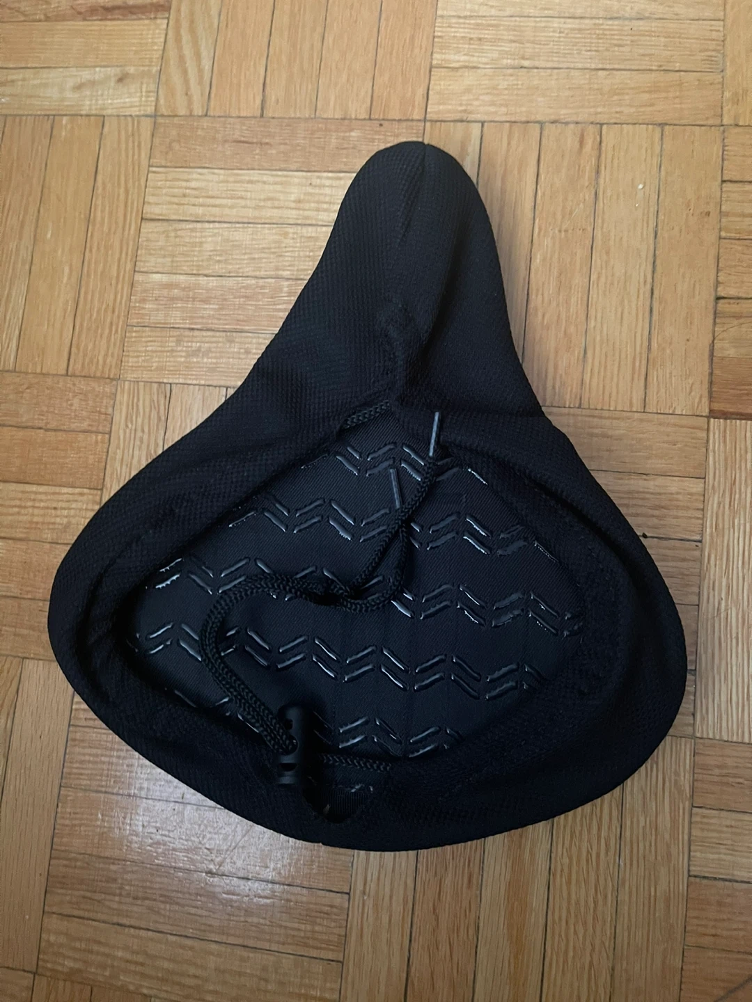 This is a Selle Royal bicycle seat cover with Royalgel padding. It features a non-slip bottom and an adjustable drawstring for a secure fit. Its design helps provide added comfort on rides.