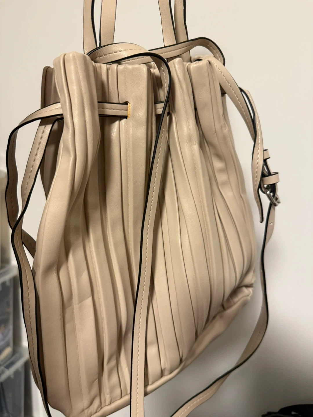 This is a ZARA beige handbag with a pleated design and drawstring closure. It's made from faux leather and has multiple straps for versatile carrying options. The interior is lined with black fabric.