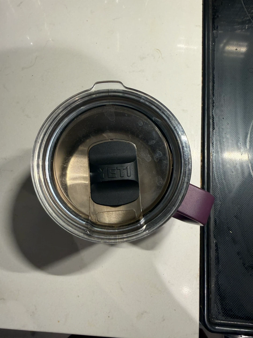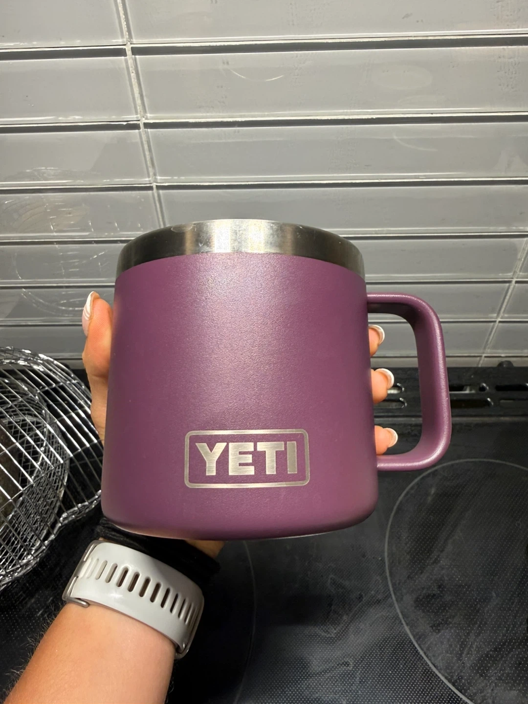Yeti Rambler mug in purple with a lid. Stainless steel construction. It's great for keeping drinks hot or cold.