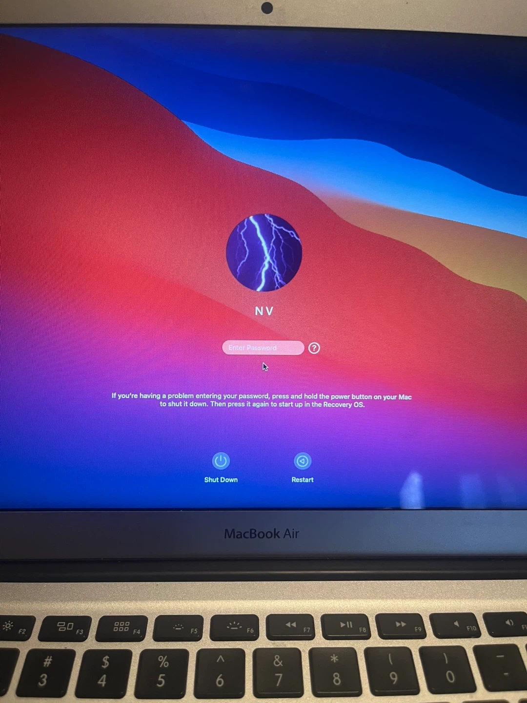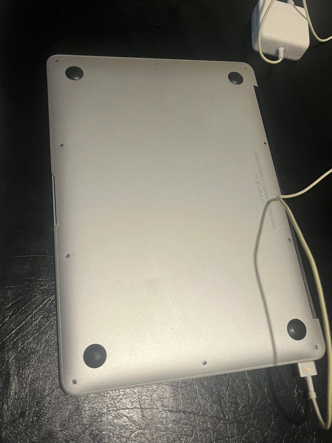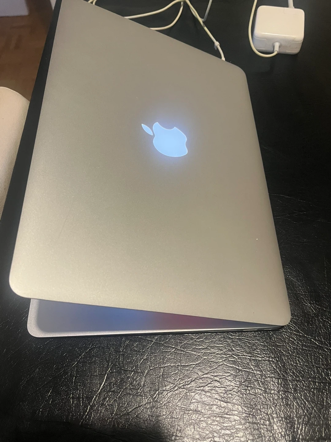 Silver Apple MacBook Air laptop. It runs macOS and features a backlit Apple logo on the lid. Includes the original charger.