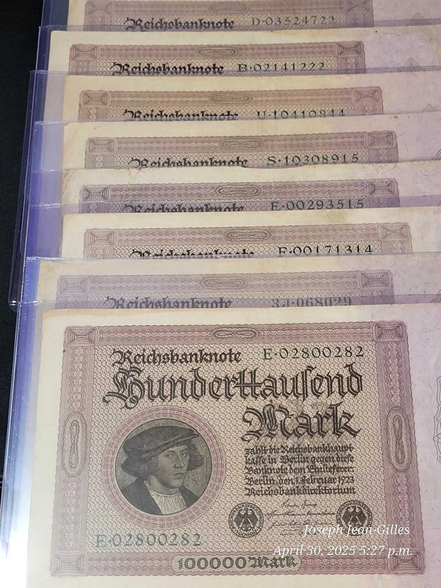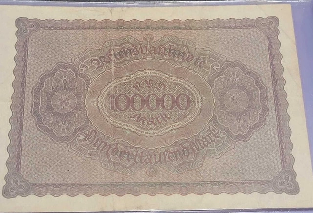 7 1923 German Banknotes in this Lot, all with the same denomination: 100,000.00 Mark. All circulated but in good condition. See pictures for details. Cash accepted.