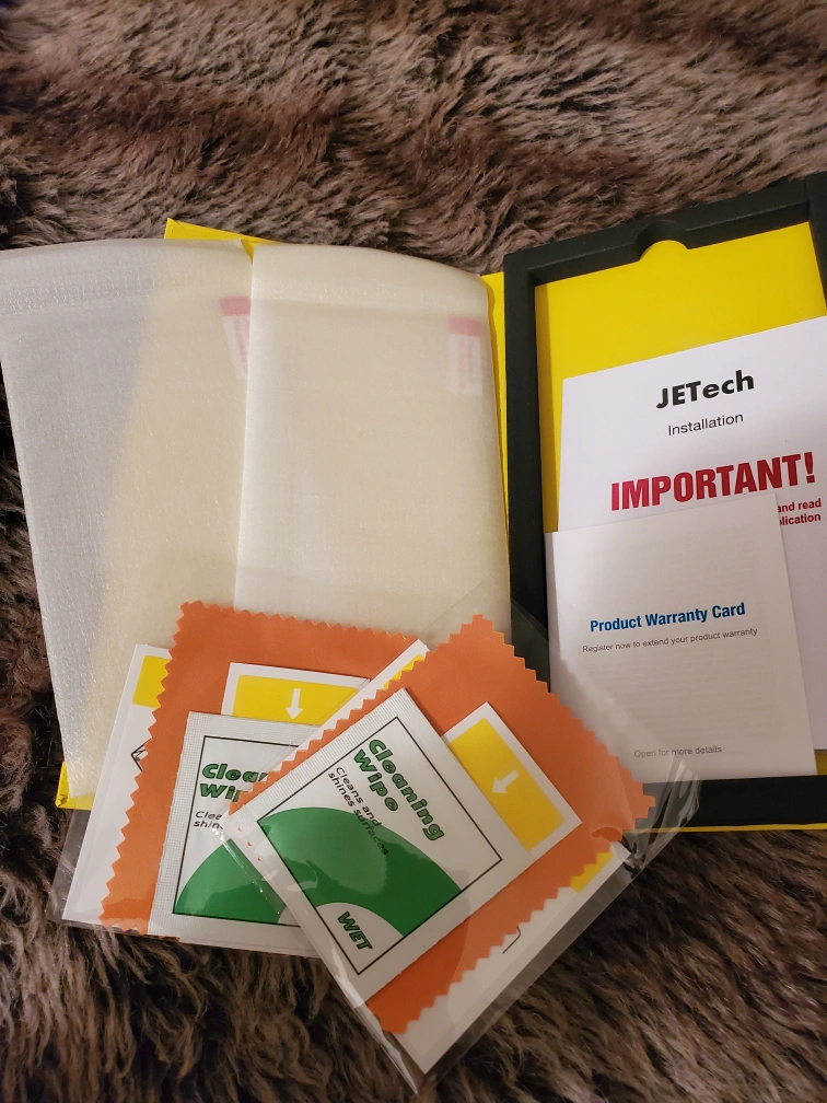 Tempered glass screen protector for iPhone. Includes cleaning wipes and installation instructions. Pack of 2