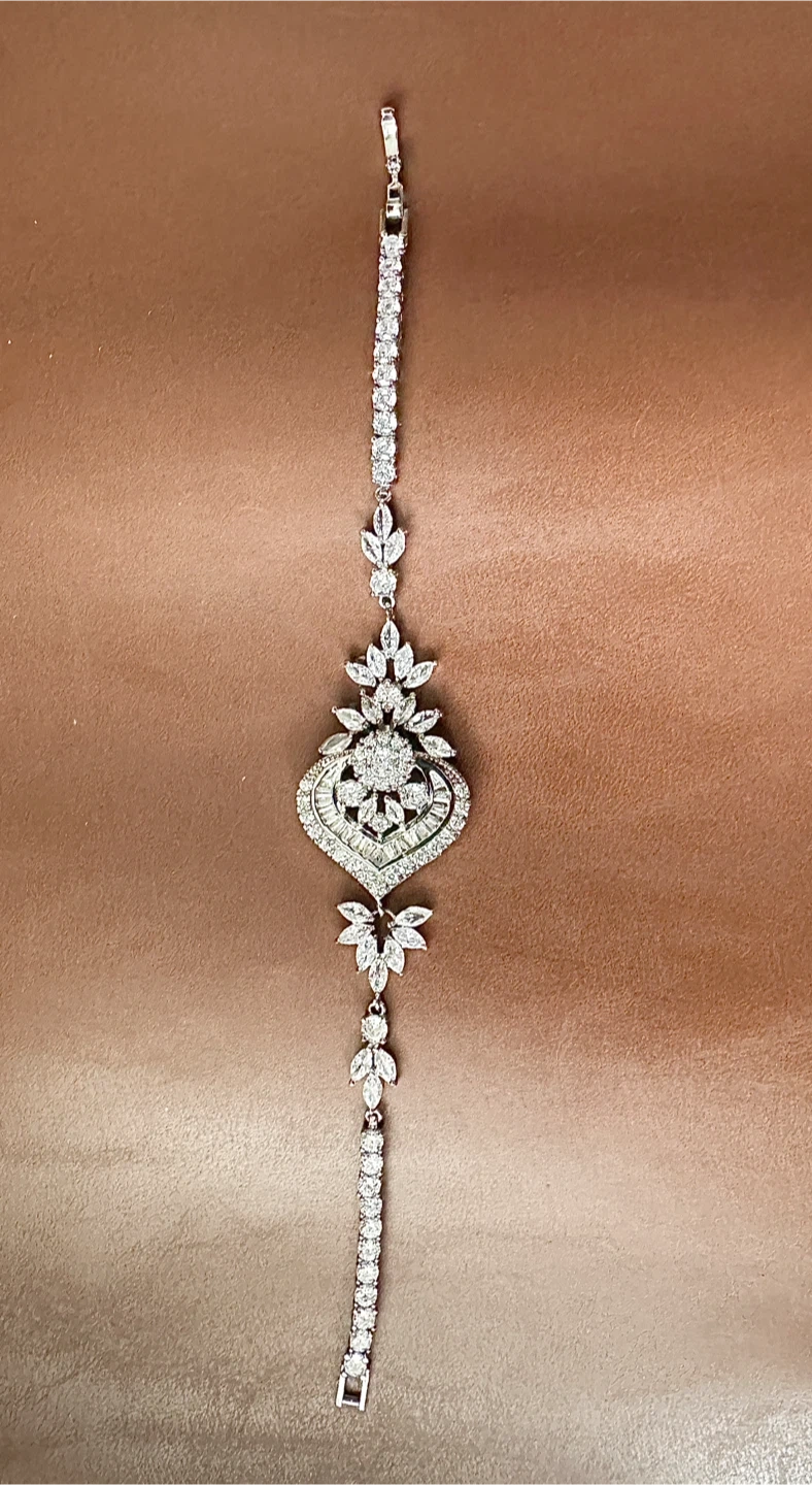 This bracelet features a stunning centrepiece with intricate detailing. It's adorned with clear stones for a brilliant shine. The chain is made of smaller, sparkling stones and fastens with a secure clasp.
