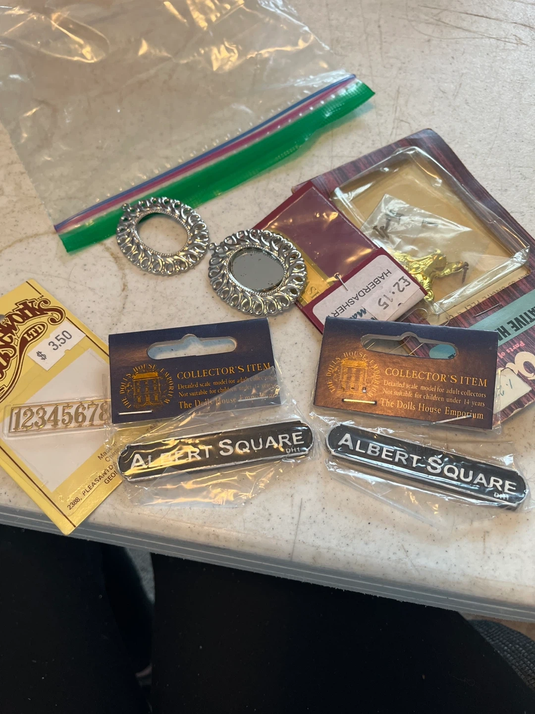 Collector's items from The Dolls House Emporium. Includes a numbered plaque and two "Albert Square" plaques. These are detailed scale models for adult collectors, not suitable for children under 14 years. Sold as one lot of 1/12 scale items