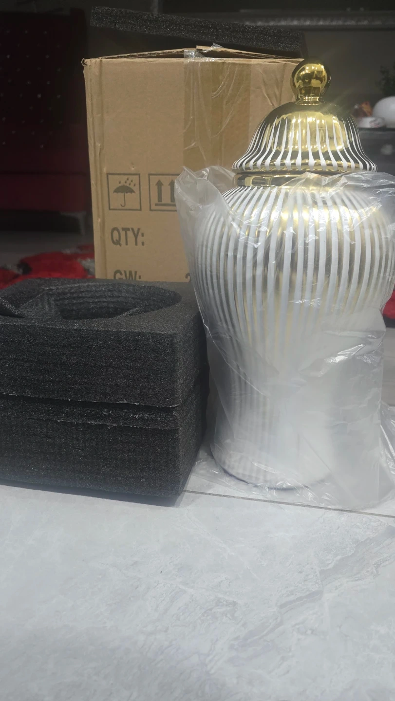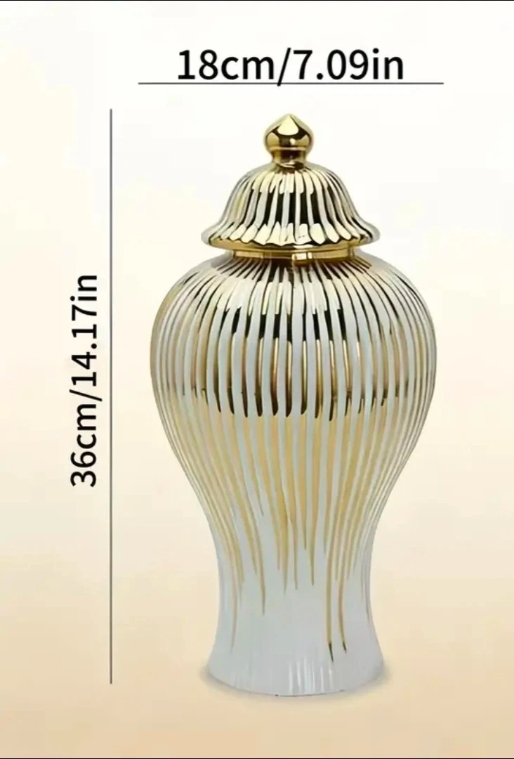 White and gold decorative ginger jar with a lid. This stylish ceramic piece stands 36cm (14.17 inches) tall and is 18cm (7.09 inches) wide. It's perfect for adding an elegant touch to your home decor. This jar comes in its original packaging with foam protection.