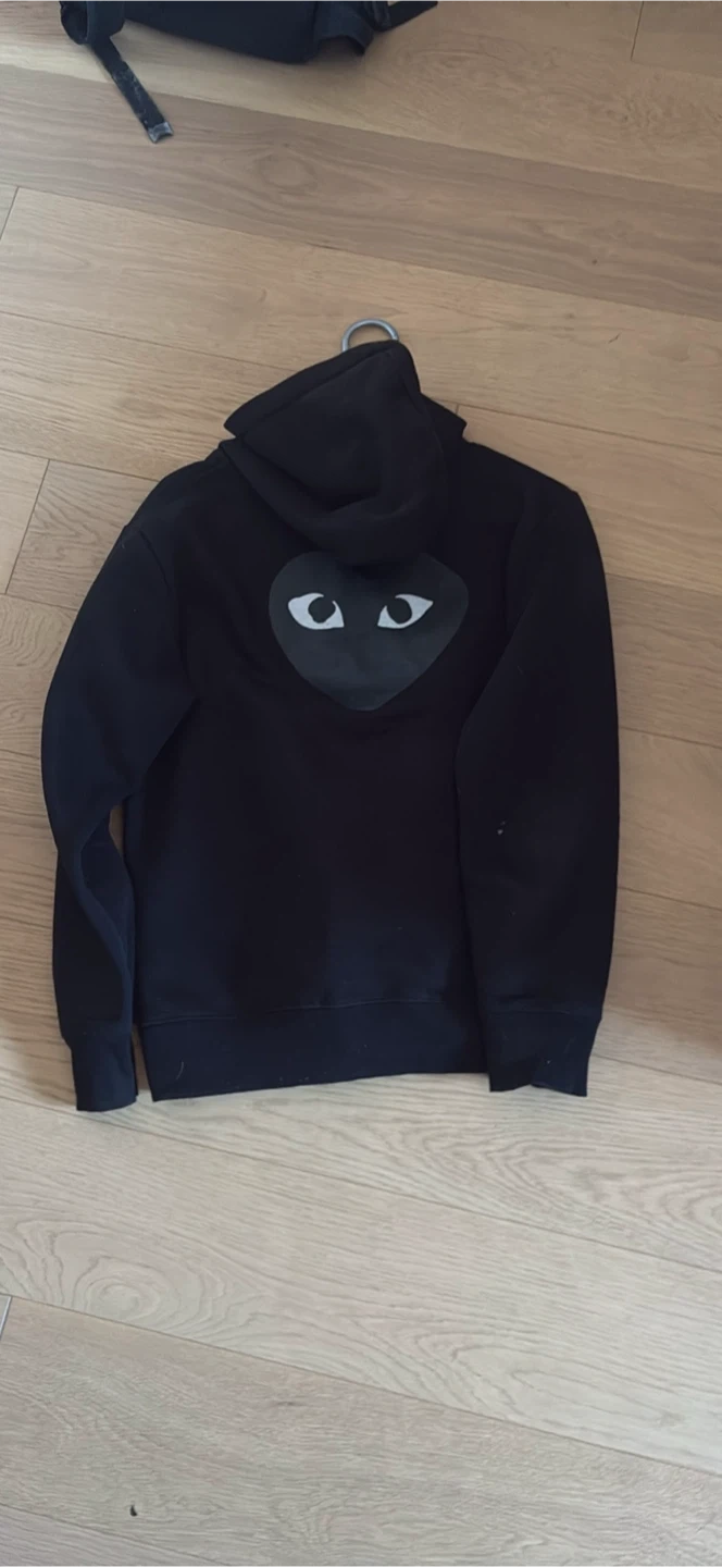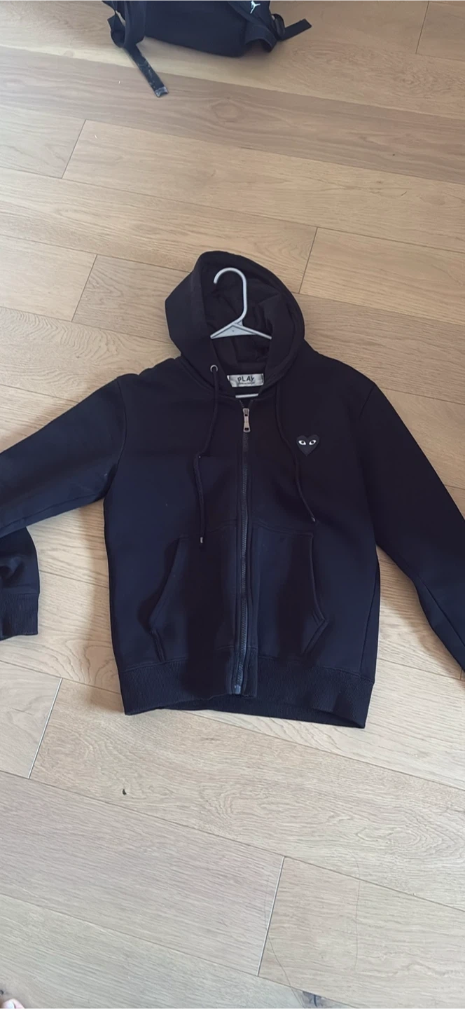 Comme des Garçons Play zip-up hoodie in black. It features the iconic heart logo on the chest and a larger heart logo on the back. Made with comfortable material.