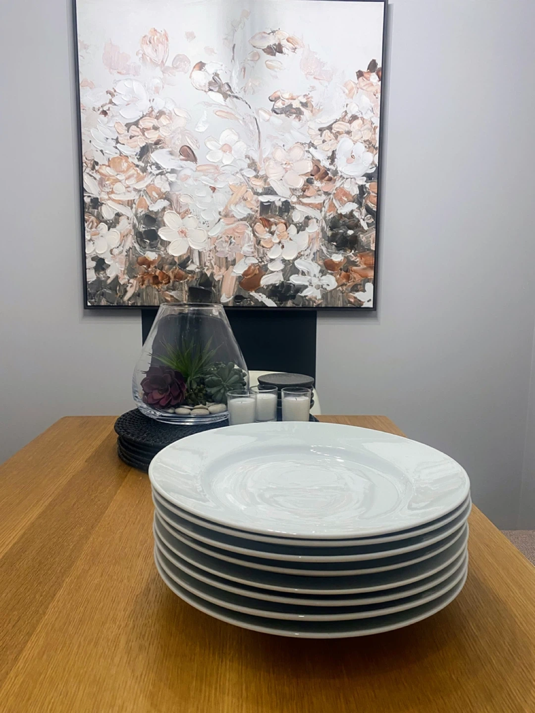 Set of eight white dinner plates from Pottery Barn. The classic shape and colour would make an excellent start to any dining set. Microwave and dishwasher safe. Only used a handful of times - no scratches, chips or dents.