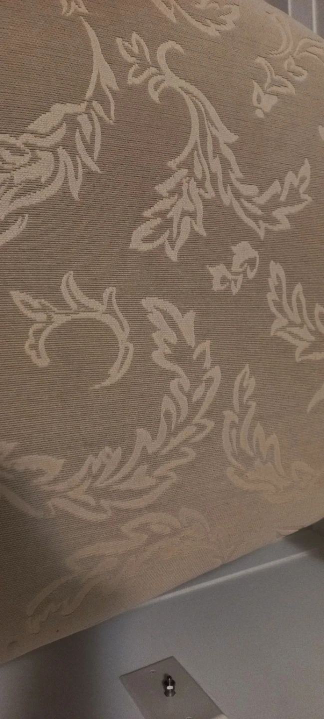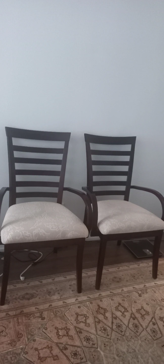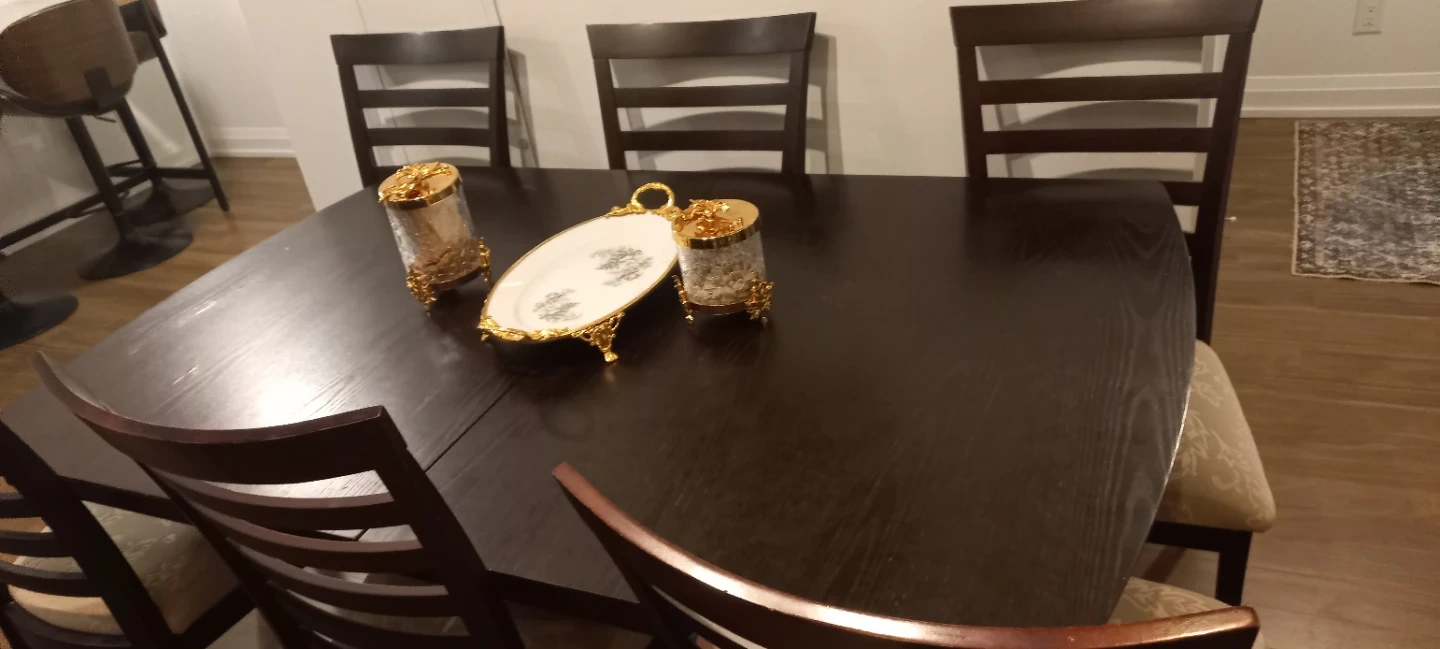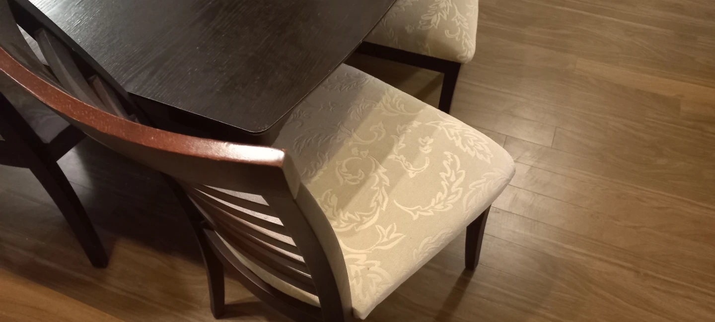 Great quality, dining table with 8 chairs featuring dark wood frames and light-coloured upholstered seats with a subtle floral pattern. The chairs have a ladder-back design and provide comfortable seating. They're perfect for a dining room or kitchen nook.