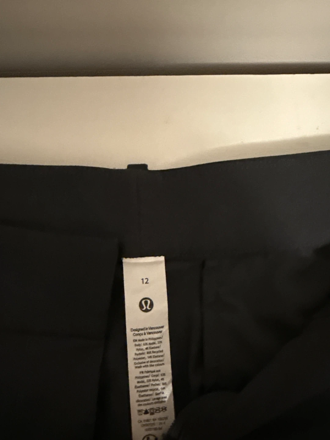 These Lululemon pants are black and a women's size 12. They are designed in Vancouver. The fabric blend includes nylon and elastane.