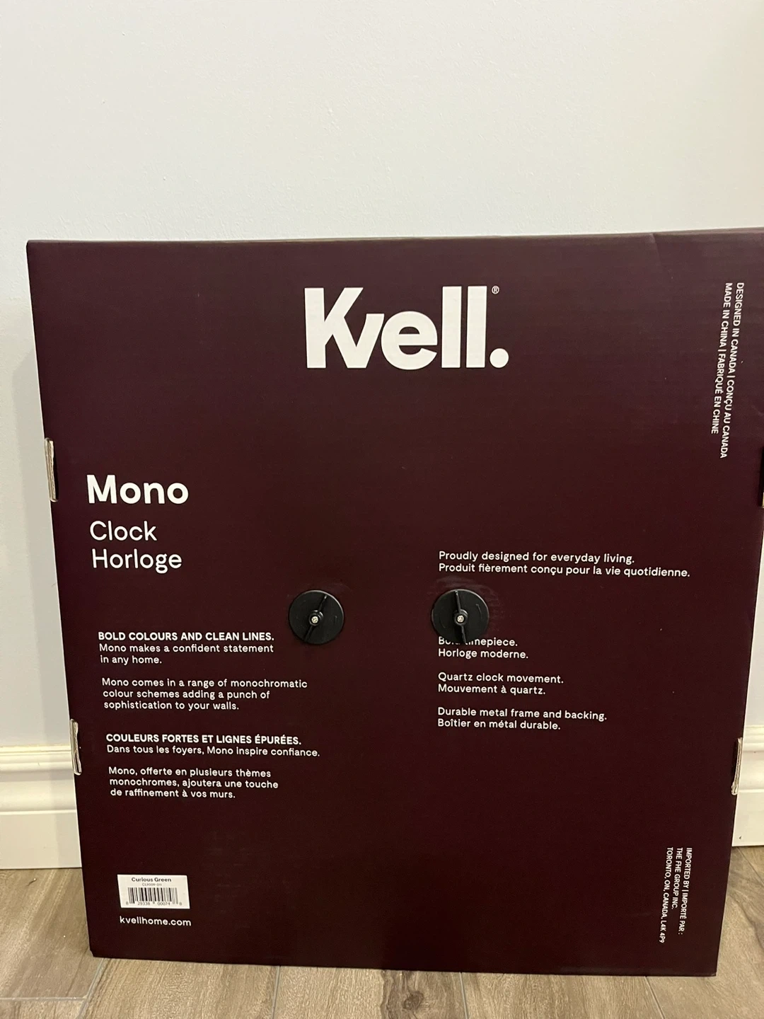 Set of 2 Wall clocks. Each $35. This Kvell Mono clock offers bold colours and clean lines. It features a quartz clock movement and a durable metal frame and backing. The clock's monochrome design adds a punch of sophistication to your walls.