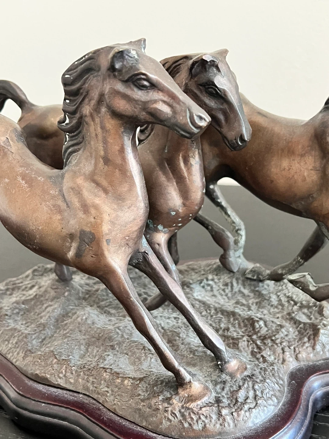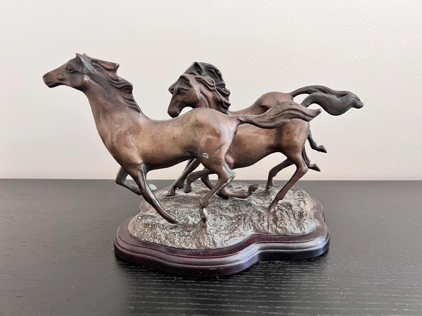 Vintage running horse brass sculpture with bronze patina on wood base. Measures approx 12.5”long x 6.5”wide x 7.75” tall