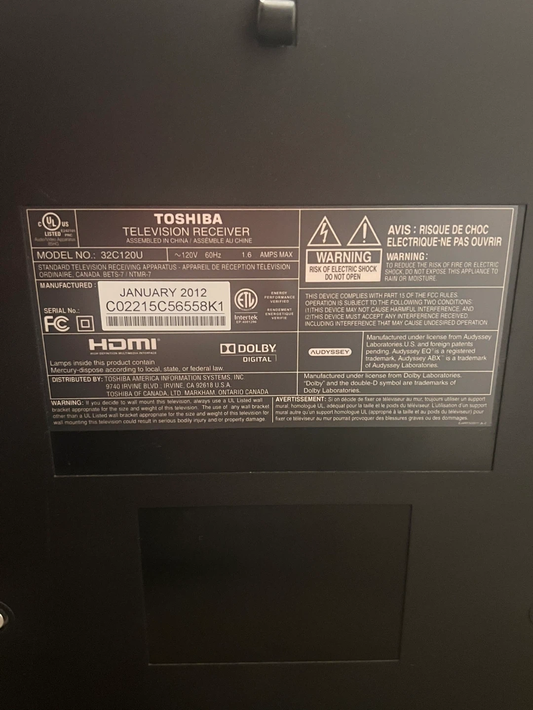 This is a Toshiba 32 inch television, model 32C120U. It was manufactured in January 2012. It features HDMI and PC inputs for connectivity. Great for a bedroom or a second display!